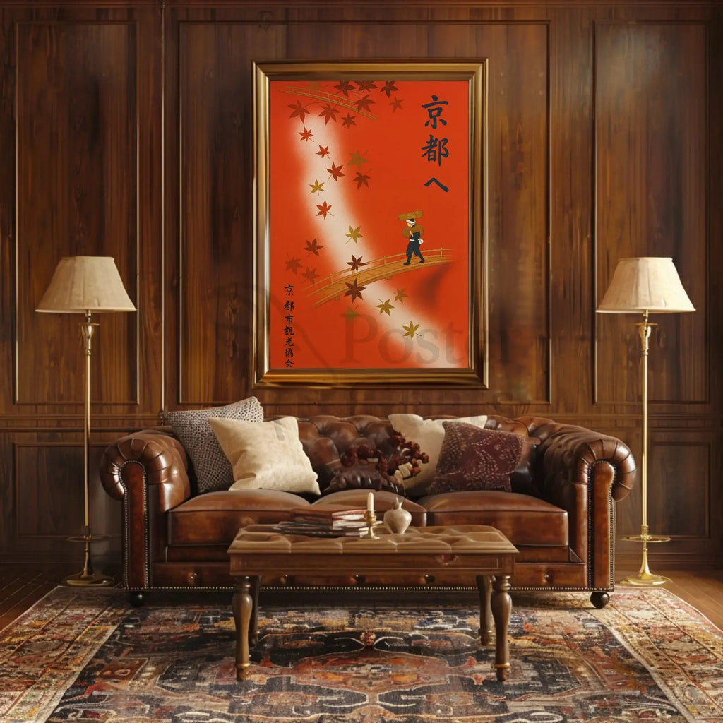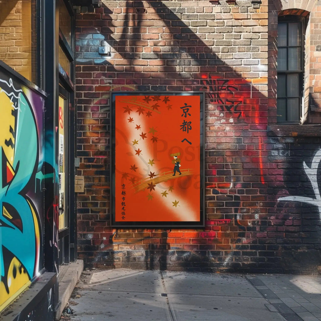 Immerse yourself in the serene beauty of autumn with the Kyoto Autumn Journey Cultural Heritage Poster. This stunning artwork masterfully captures the essence of Kyoto’s historic charm through vibrant Japanese maple leaves, traditional attire, and the graceful silhouette of a lone figure crossing a timeless bridge.