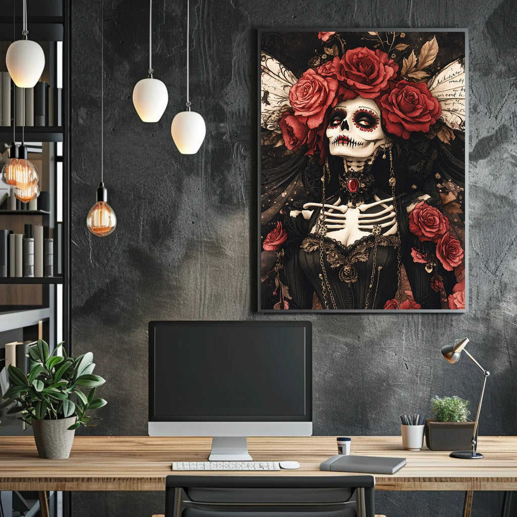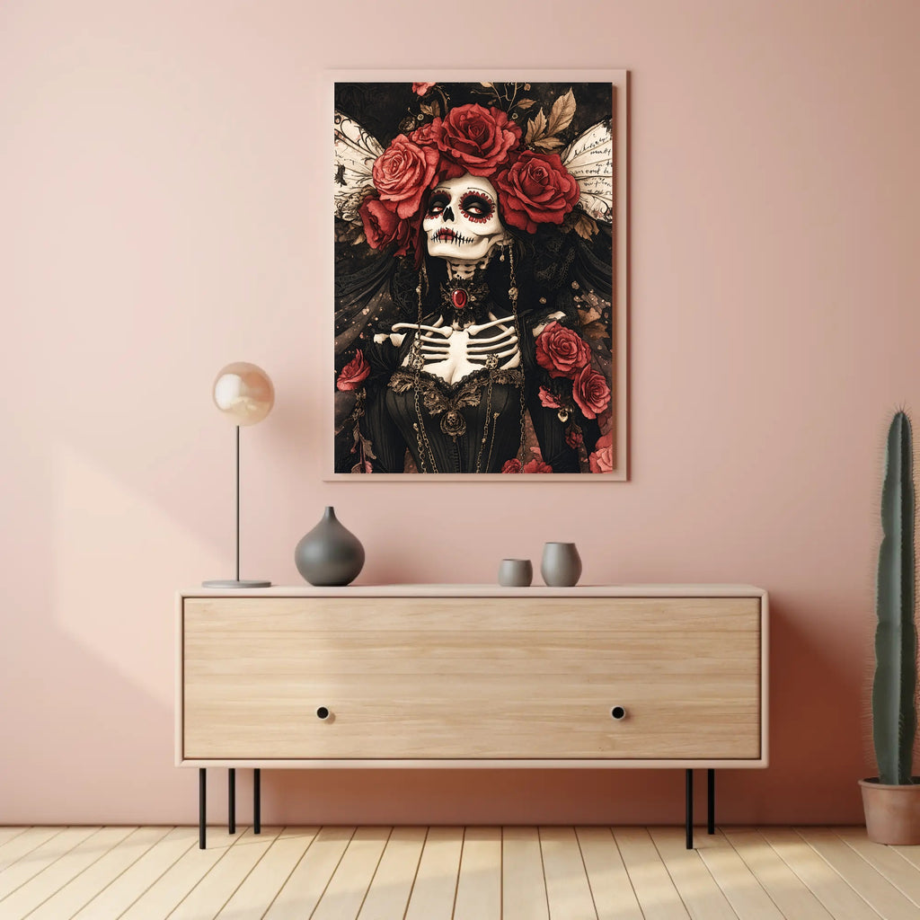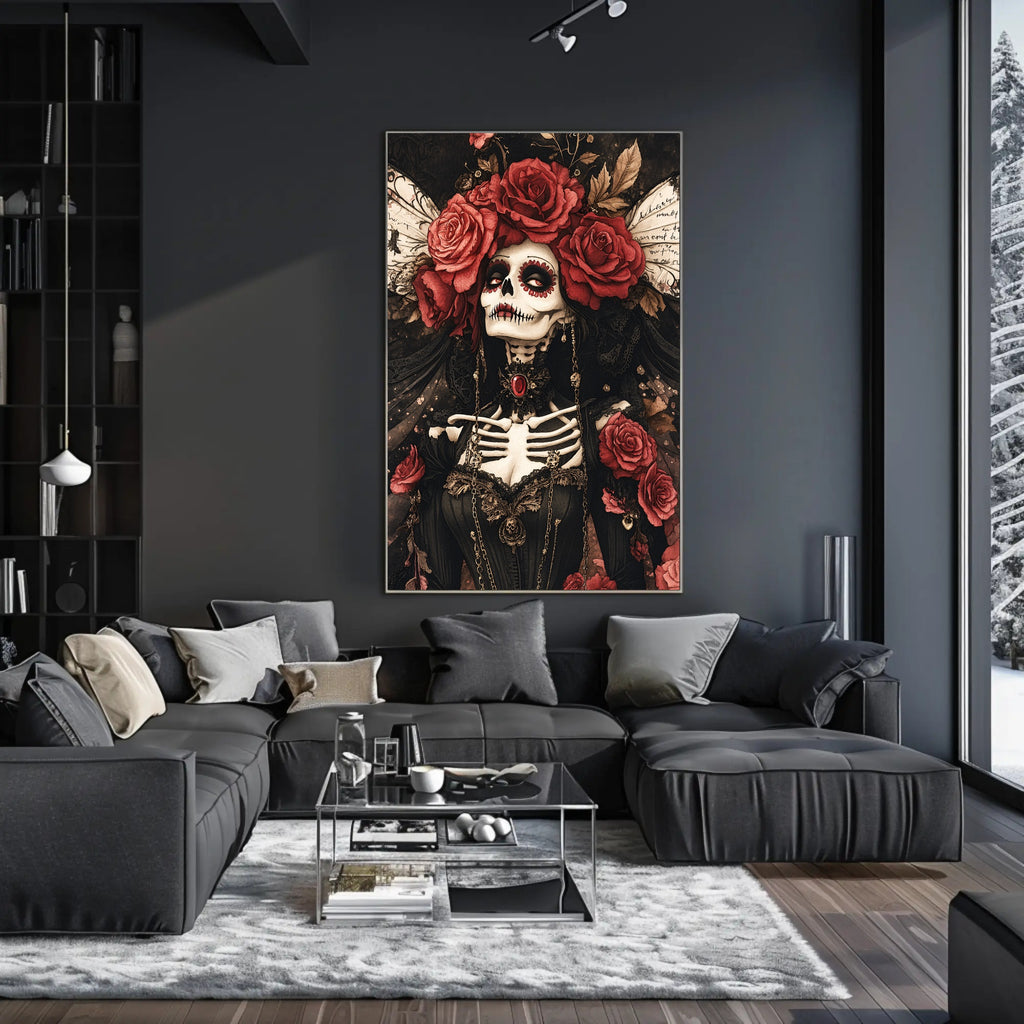 Why you'll love it: The artwork blends intricate linework and rich, moody tones to capture La Catrina's elegant spirit. Detailed skull makeup, a corseted silhouette, and a glowing ruby pendant create a focal point that draws the eye and sparks conversation. Perfect for decor lovers, Halloween enthusiasts, and collectors of pop art and scenic-inspired prints.