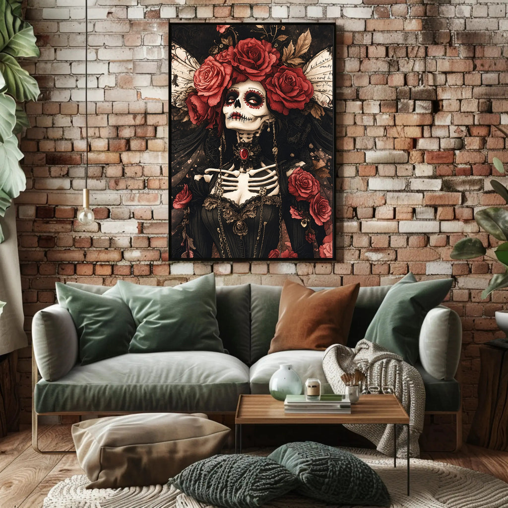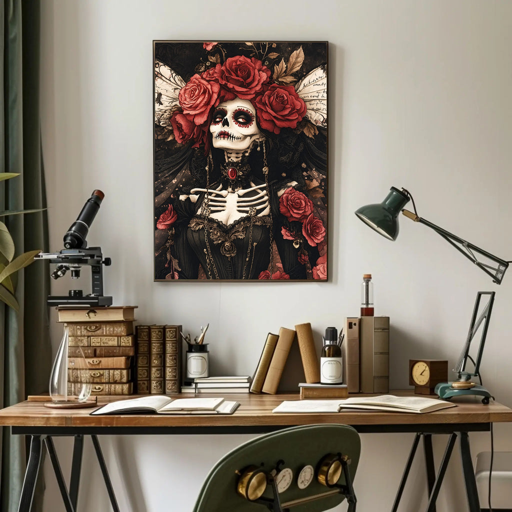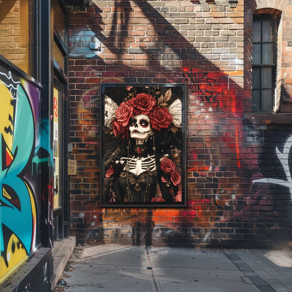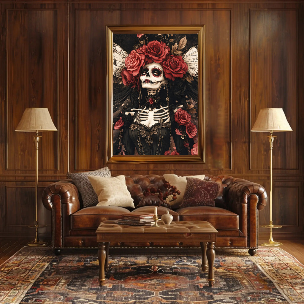 Why you'll love it: The artwork blends intricate linework and rich, moody tones to capture La Catrina's elegant spirit. Detailed skull makeup, a corseted silhouette, and a glowing ruby pendant create a focal point that draws the eye and sparks conversation. Perfect for decor lovers, Halloween enthusiasts, and collectors of pop art and scenic-inspired prints.