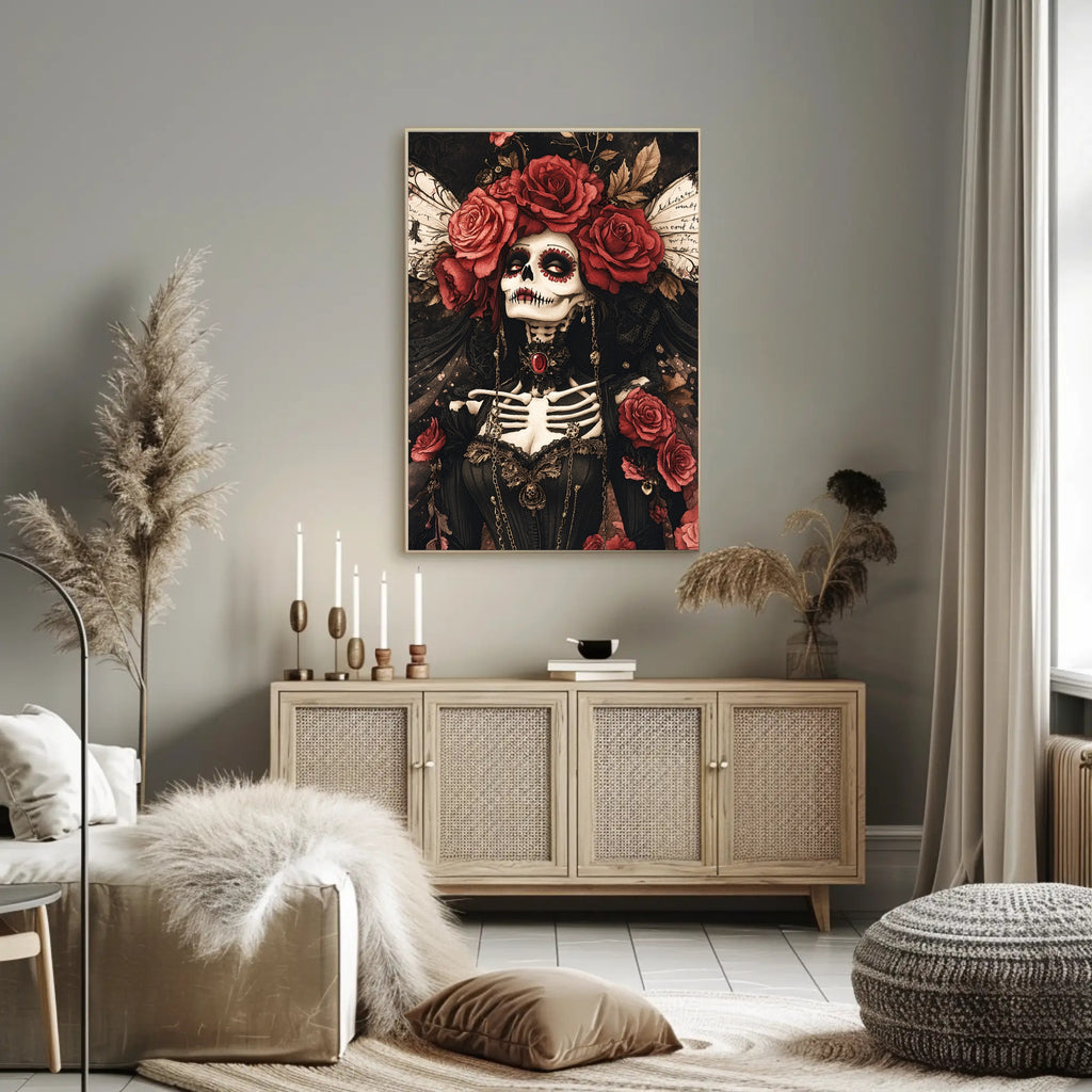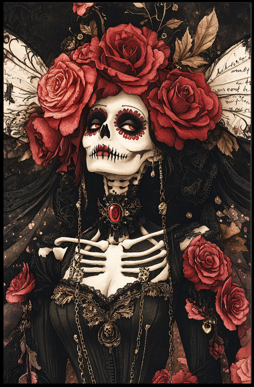 Bring timeless Mexican iconography and pop‑art romance into your home with the La Catrina Elegance Poster from PosterGoat. This striking art print features a regal skeletal figure adorned with a crown of lush red roses, vintage lace, and ornate jeweled chains — a hauntingly beautiful centerpiece that elevates any room with dramatic flair.