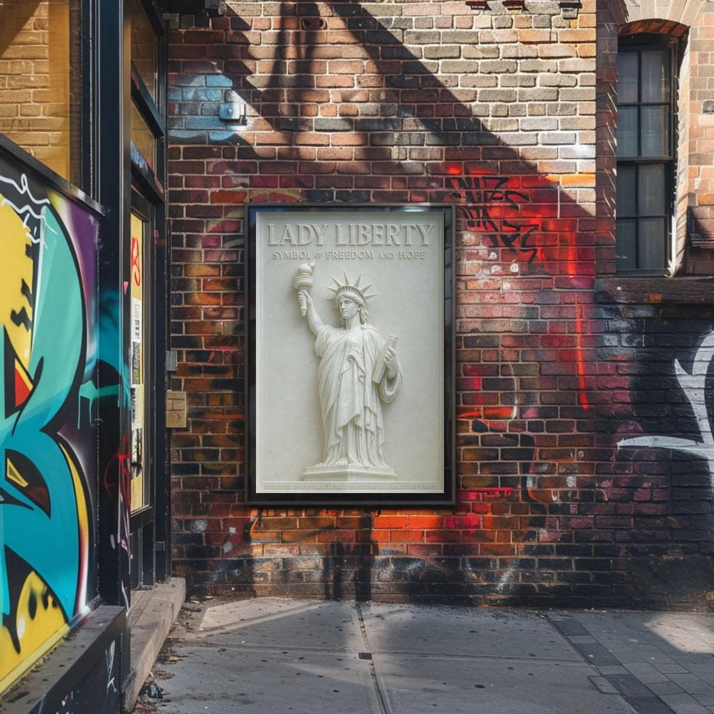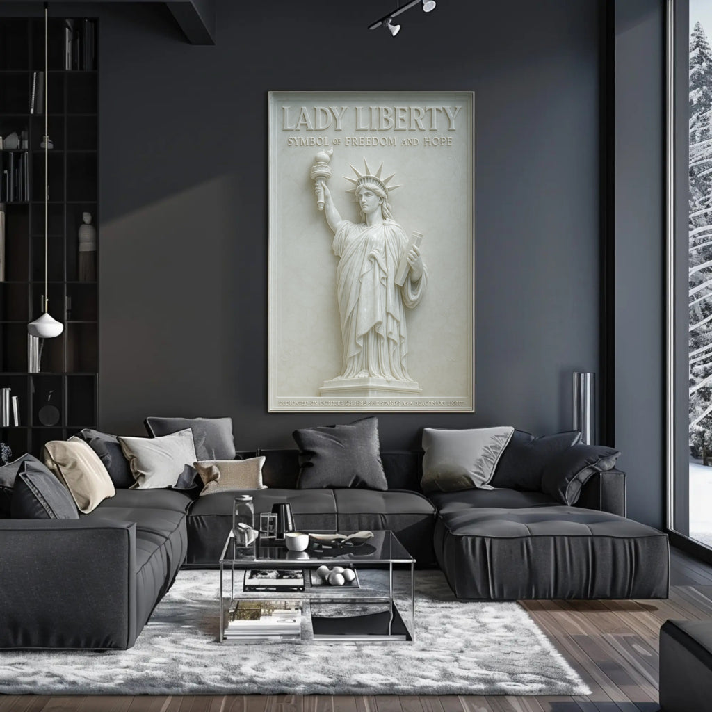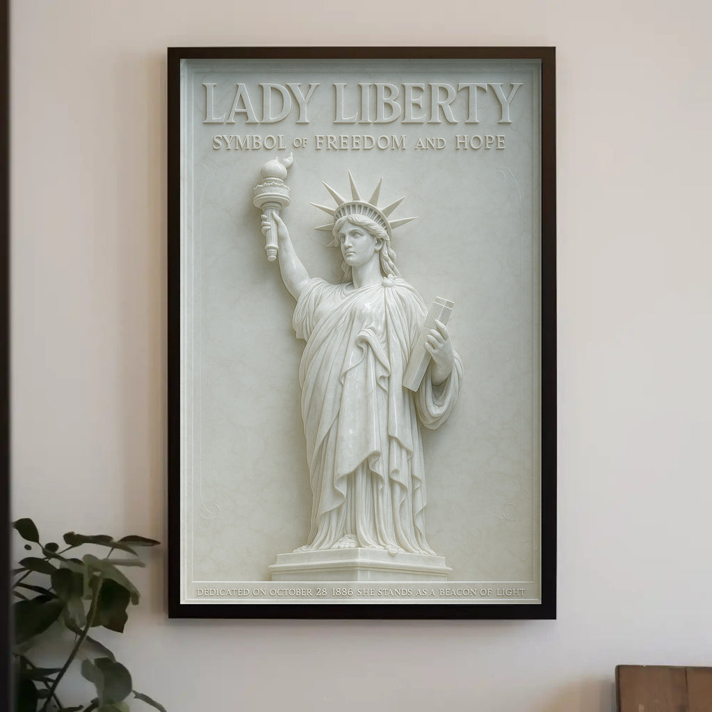 Bring a timeless symbol of freedom and hope into your home with the Lady Liberty Freedom Hope Cultural Heritage Poster from PosterGoat. Rendered in a refined neoclassical bas‑relief style, this monochromatic print captures the dignified presence of the Statue of Liberty with sculptural detail, elegant drapery folds and an engraved dedication—perfect for lovers of American culture, historical significance, and minimalist artistic decor.