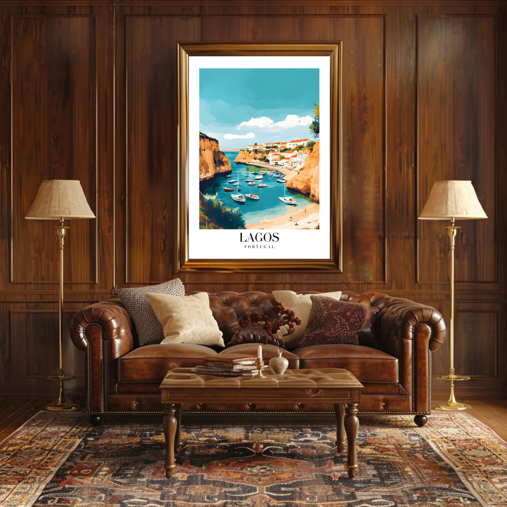 Bring the sun-soaked charm of southern Portugal into your home with this Lagos Coastal Harbor Scene modern travel poster from PosterGoat. The painterly, mid-century modern illustration captures a tranquil harbor tucked between golden cliffs, turquoise waters dotted with moored boats, and whitewashed houses topped with iconic red-tiled roofs — an idyllic coastal scene that instantly evokes seaside holidays and Mediterranean serenity.