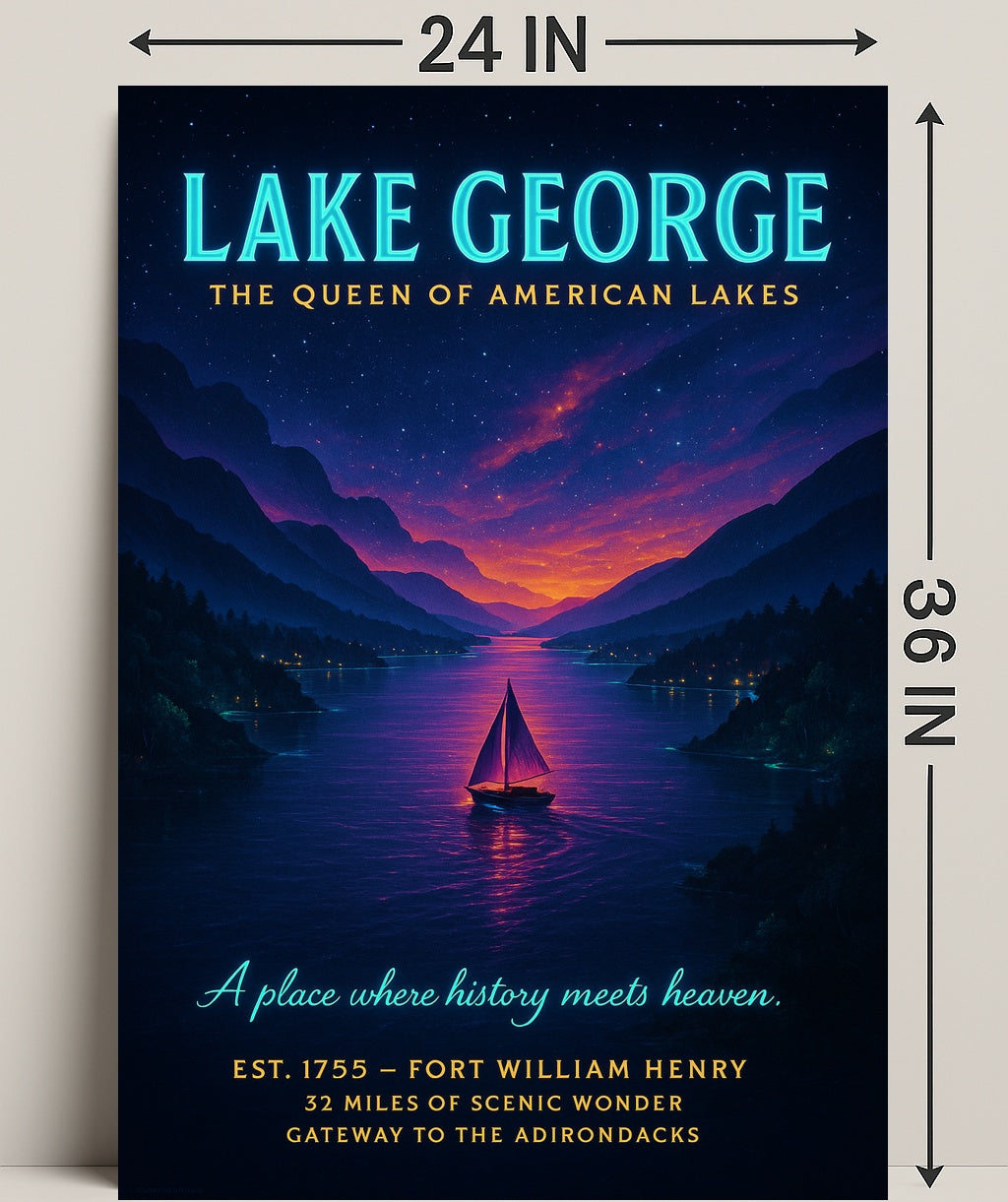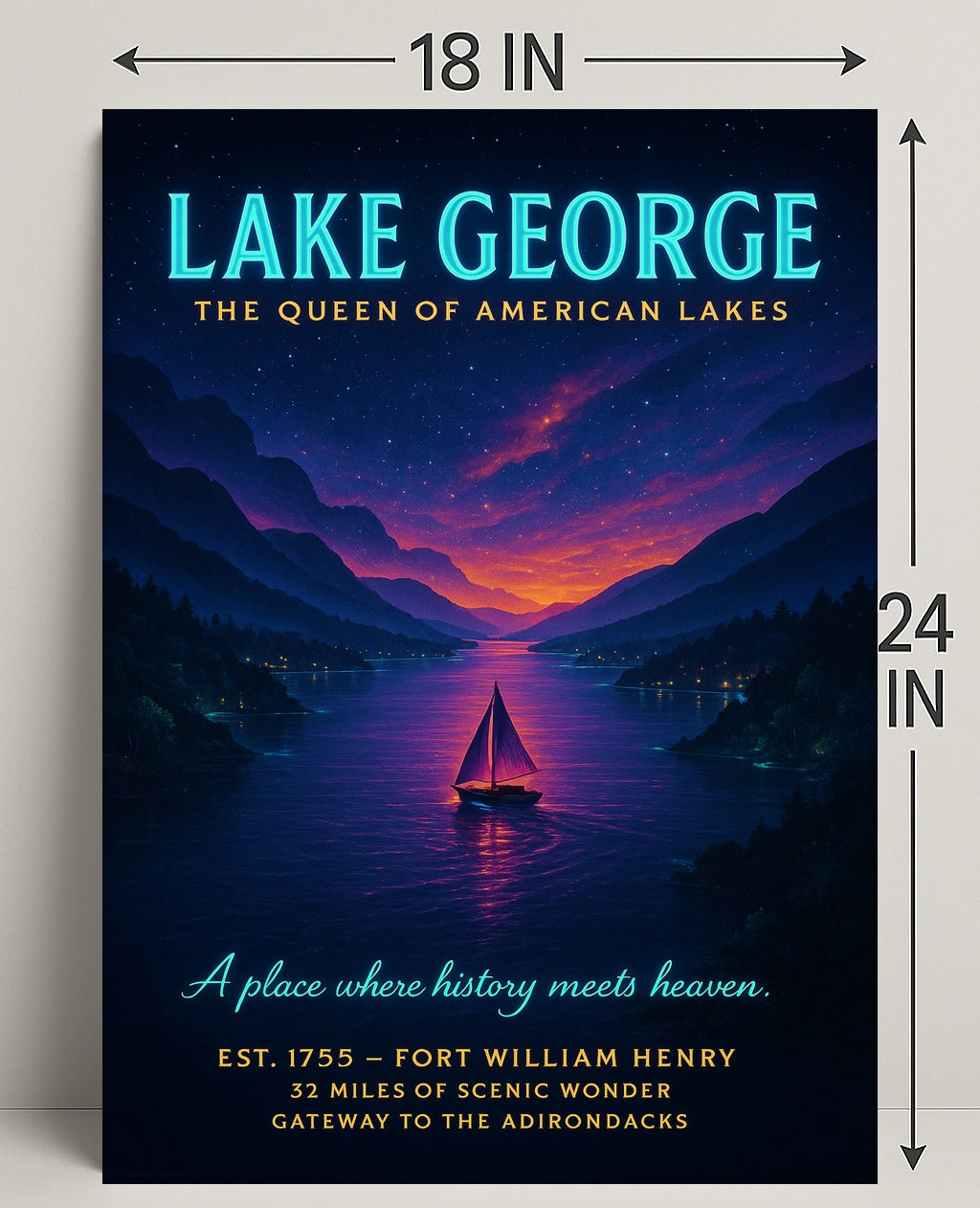 - Themes & style: Blends Travel & Places with Art & Aesthetic in a Minimalist, scenic composition celebrating Lake George and its heritage.