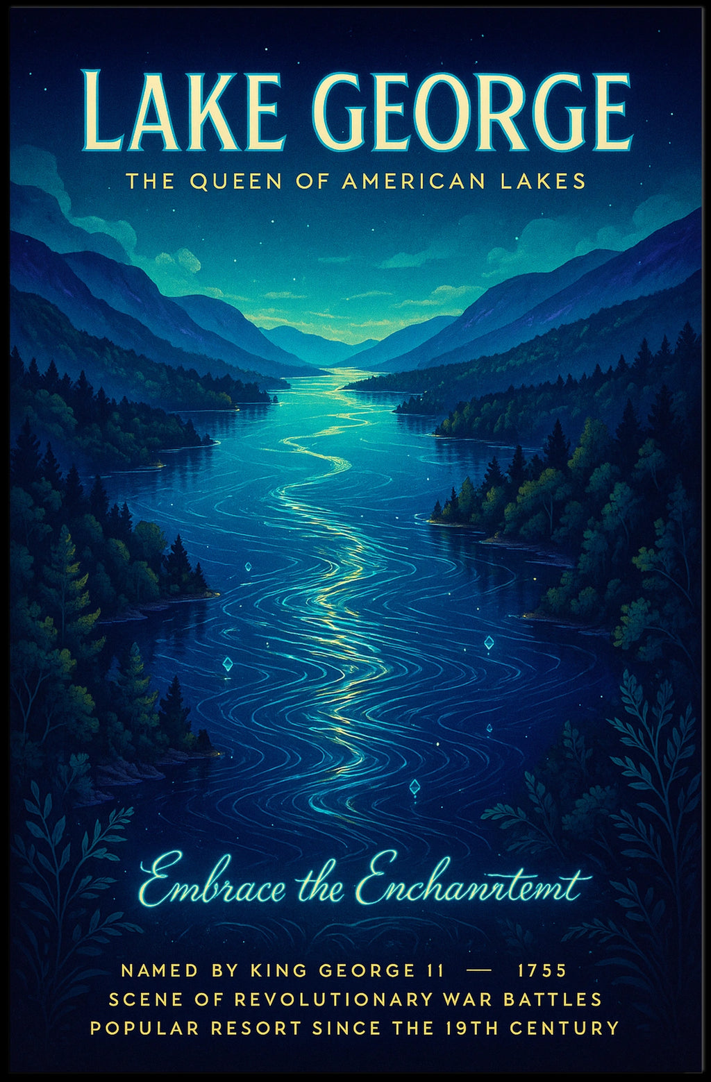 Experience the serene beauty of Lake George with this exquisitely crafted vintage-style travel poster. Rendered in calming blues and greens, it captures a tranquil twilight scene where the lake rests among forested mountains beneath a star-lit sky. With historical resonance and timeless travel-art charm, this piece brings a touch of nostalgic wanderlust to any room.