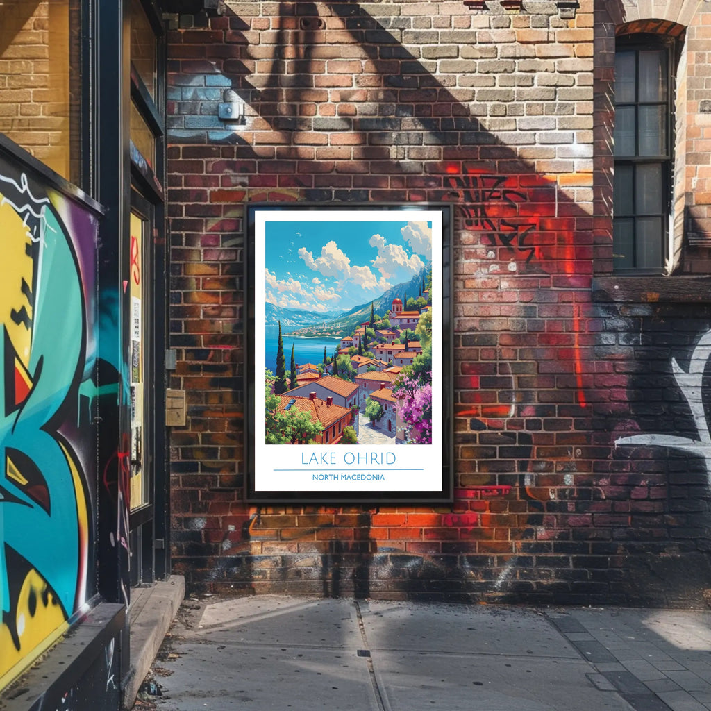 This travel poster captures the essence of Lake Ohrid, North Macedonia. Designed for decor lovers and wanderlust spirits, this art print adds charm to any room with visuals inspired by real-world scenery.