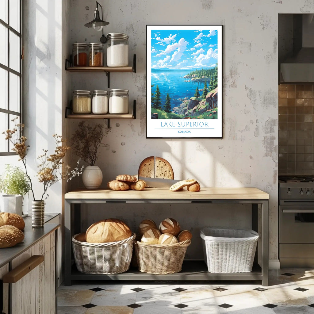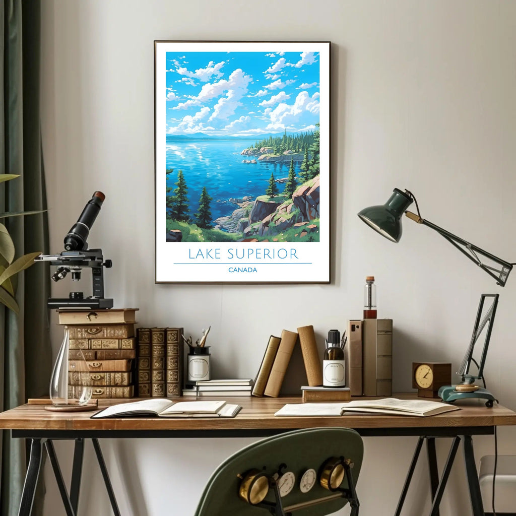 Bring the tranquil beauty of the North to your walls with the Lake Superior Serenity Poster from PosterGoat. This minimalist, vintage-inspired travel poster captures sweeping blue skies, glassy lake waters, rugged rocky shores and a forested coastline — a scenic landscape print that evokes wanderlust and calm in equal measure.