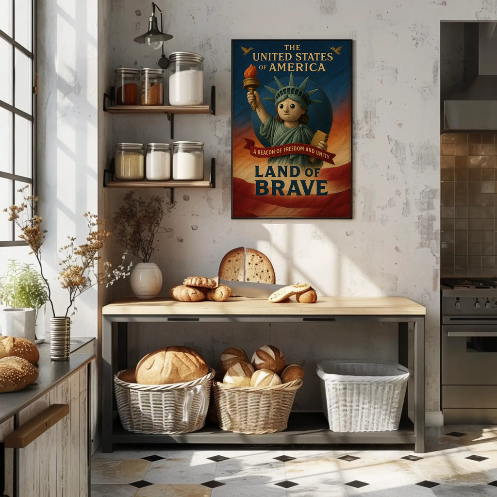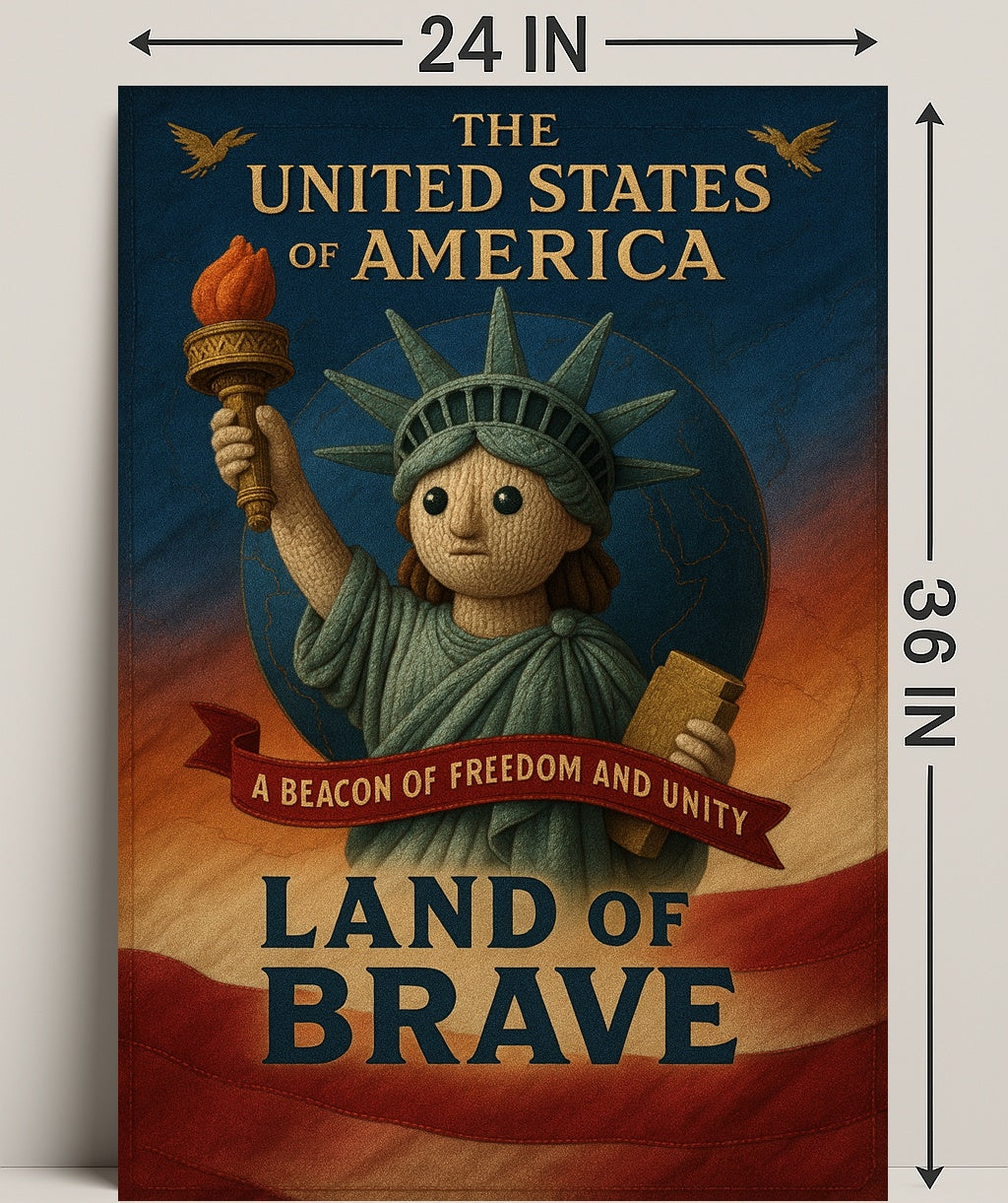 Celebrate courage and unity with the "Land of the Brave" poster from PosterGoat — a striking piece of wall art that blends patriotic symbolism with photorealistic texture and vintage travel-poster charm.