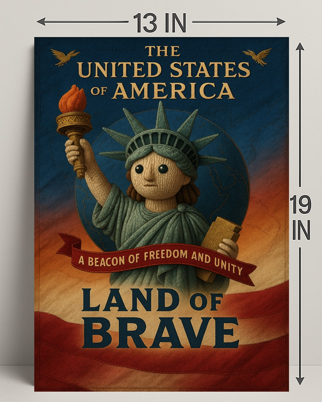 This design presents a stylized Statue of Liberty figure holding a glowing torch and tablet, framed by a deep navy globe and sweeping red-and-cream flag waves. A bold ribbon reading "A Beacon of Freedom and Unity" and large, commanding type that proclaims LAND OF BRAVE make this poster an instant focal point for any room.