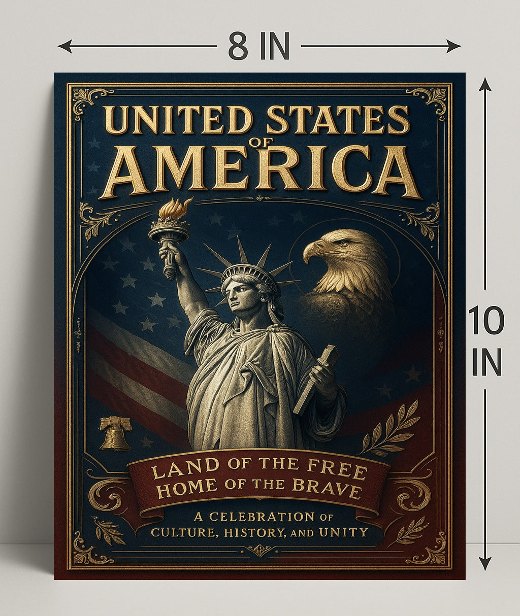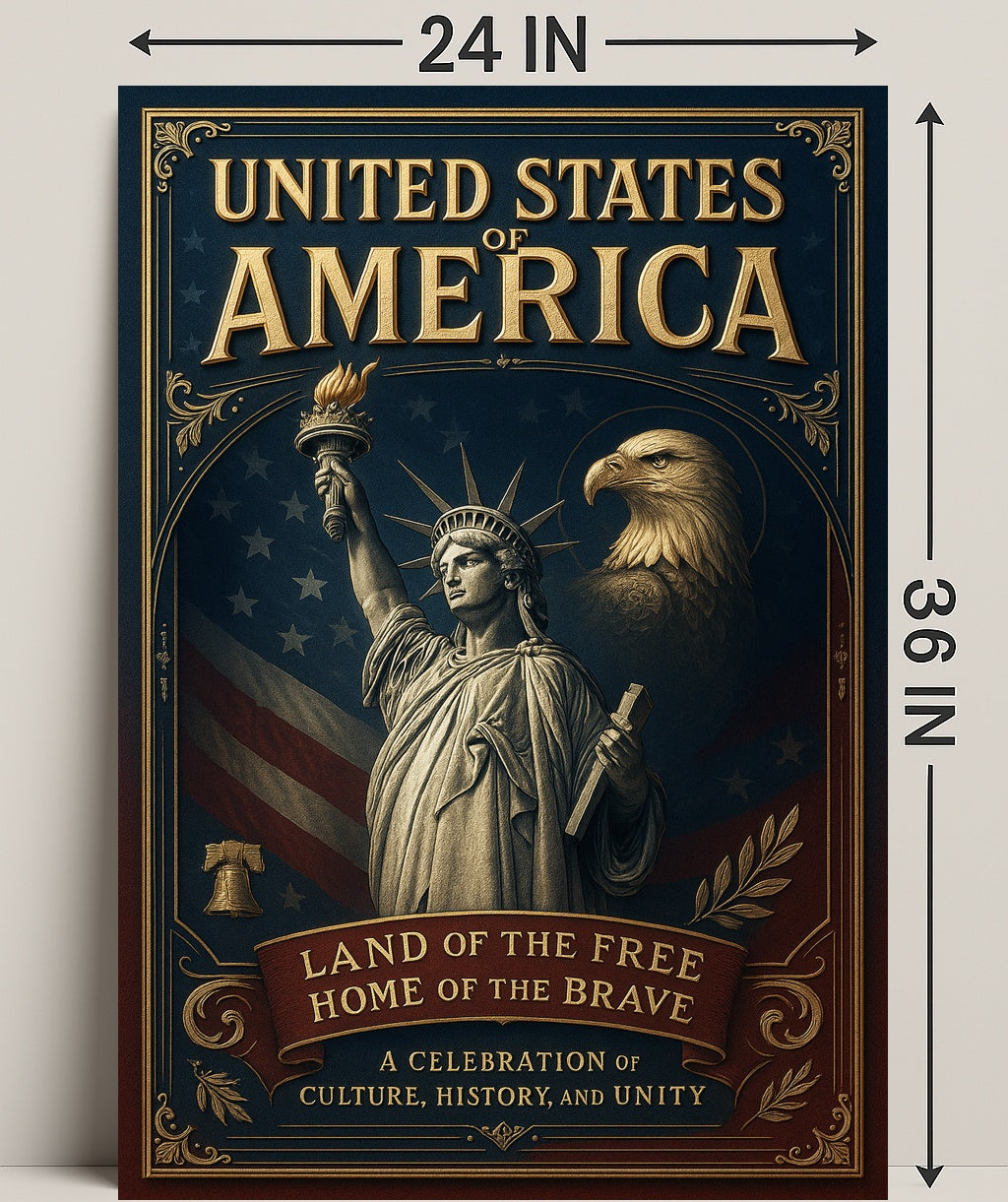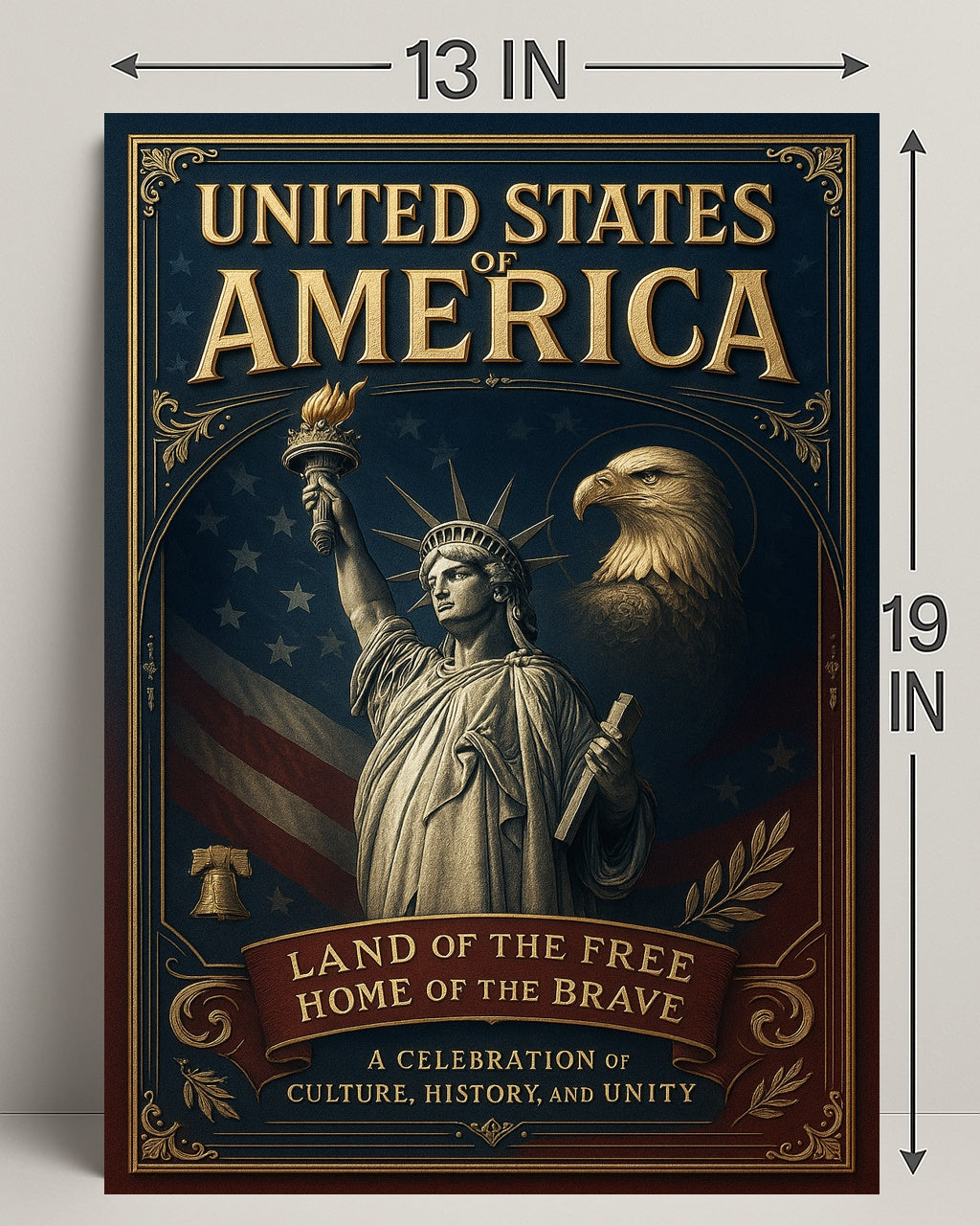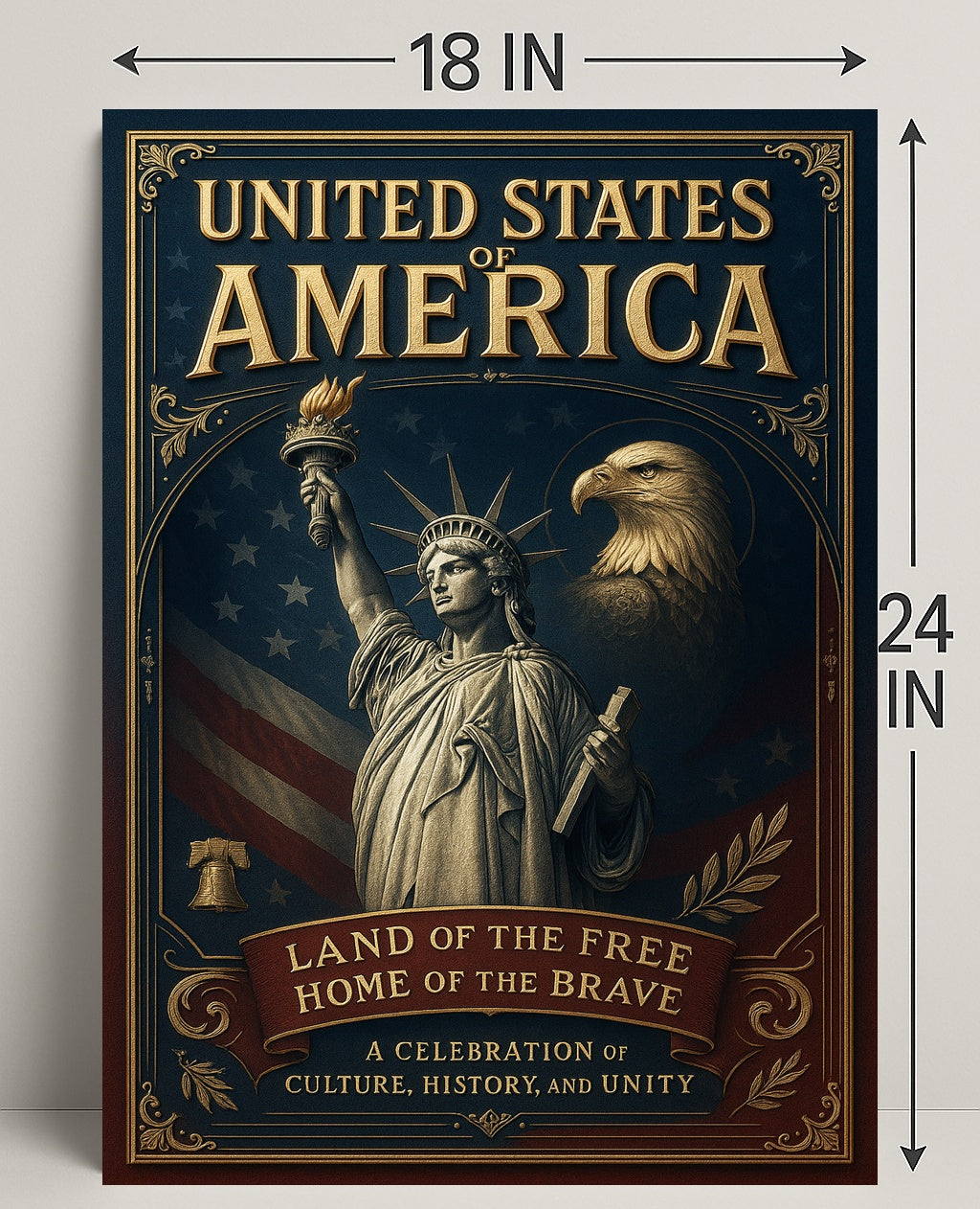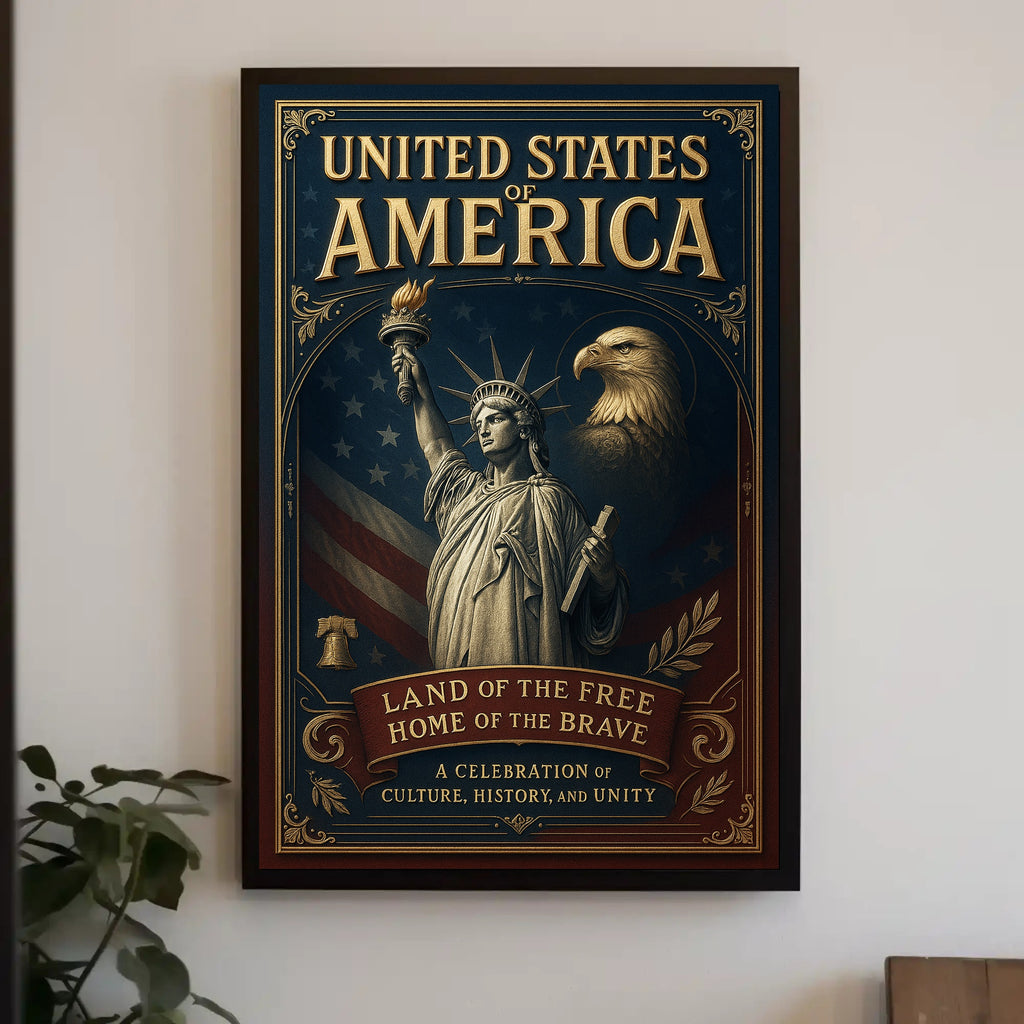 Celebrate patriotism with the "Land of the Free, Home of the Brave" poster by PosterGoat — a richly detailed, vintage-collage style art print that blends classic Americana with museum-grade design. Featuring a sculptural Statue of Liberty, a noble eagle portrait, and elegant gold-embossed typography, this poster creates a powerful focal point for any room.