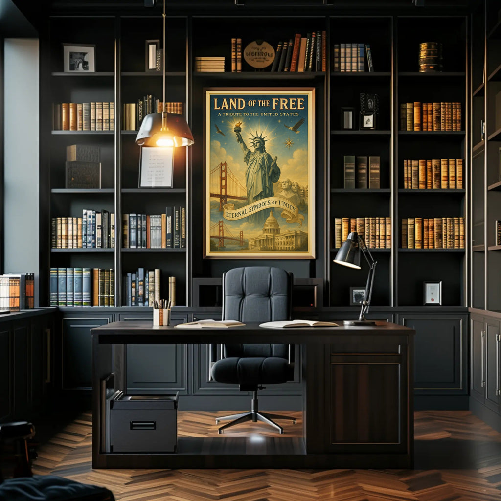 - High visual impact: Bold headline “LAND OF THE FREE” and decorative banner emphasize message and enhance wall presence.
