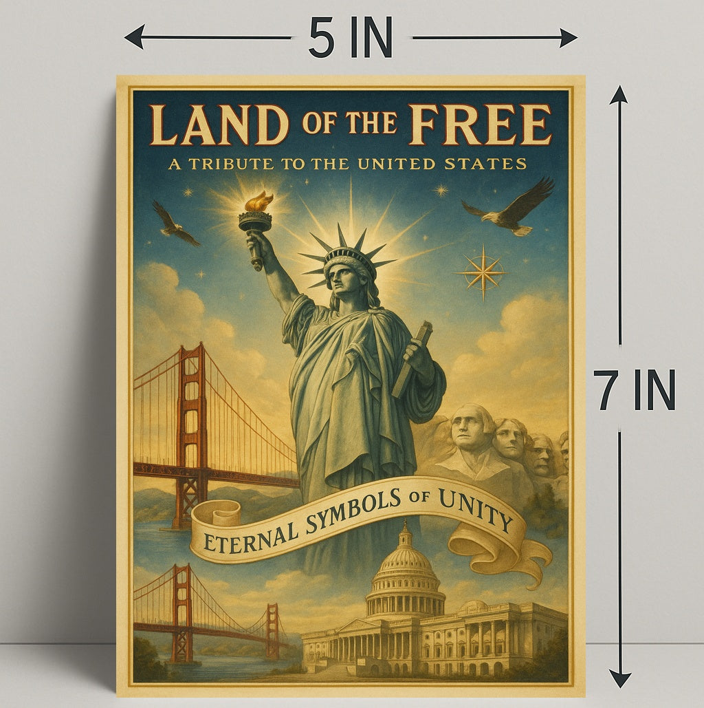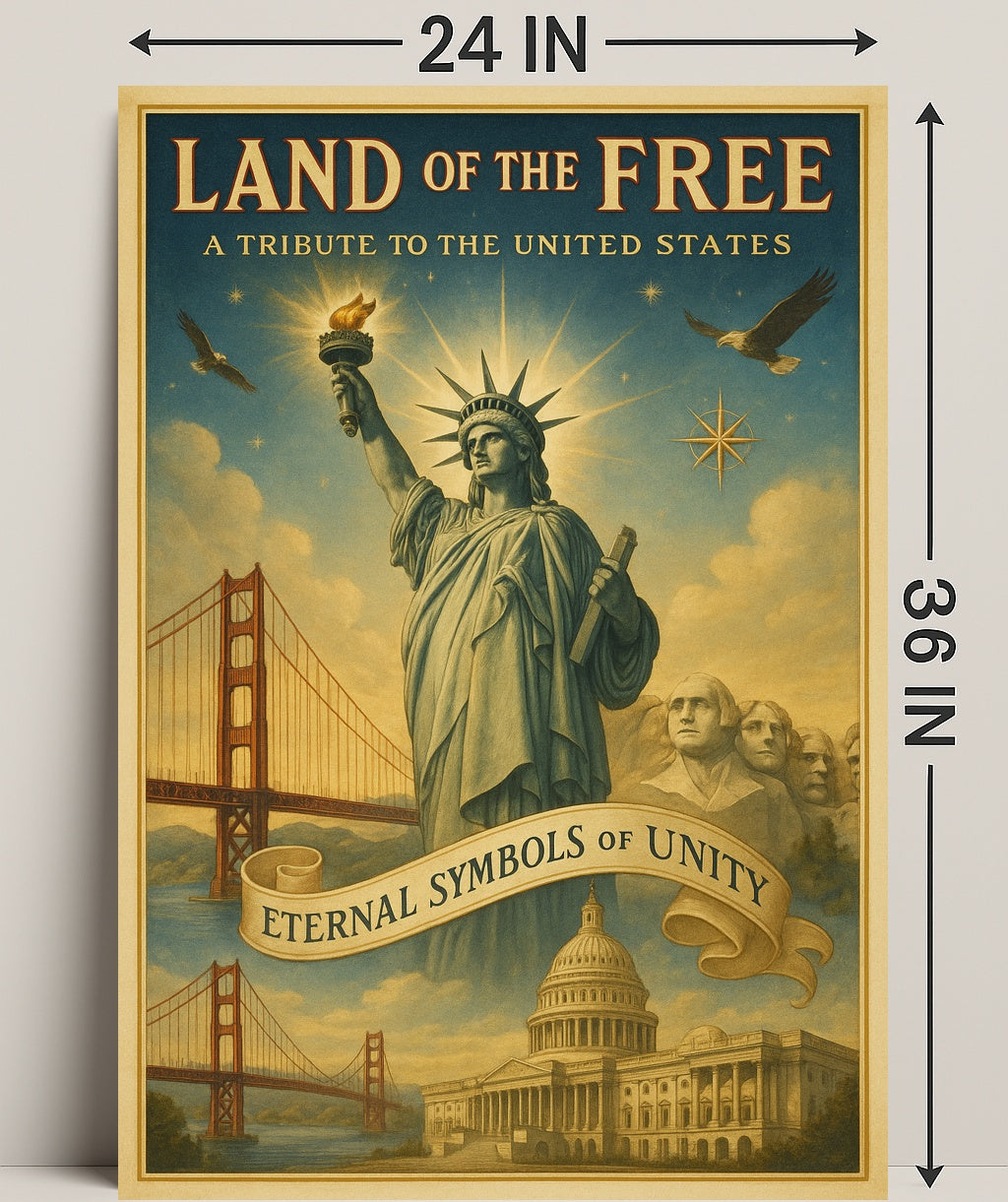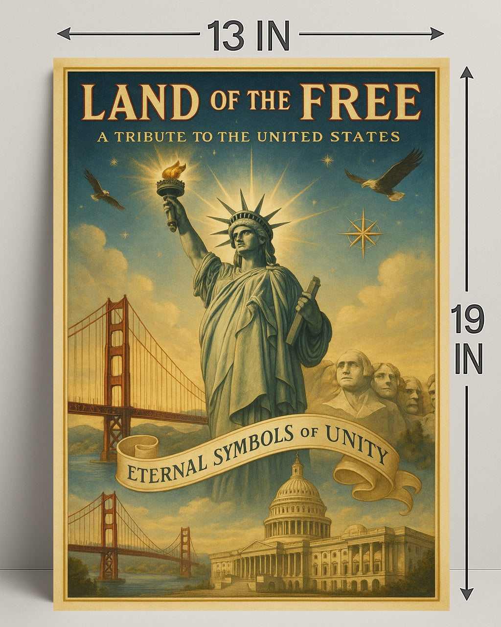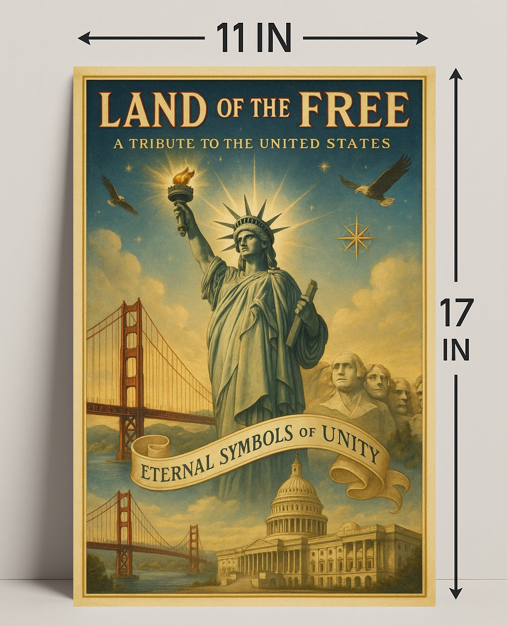 Celebrate the spirit of America with the Land Of The Free Poster — a vintage-inspired art print from PosterGoat that brings iconic U.S. landmarks and timeless symbolism into your home or office. Rendered in warm, muted tones with classic poster typography, this piece combines the Statue of Liberty, Golden Gate Bridge, U.S. Capitol and Mount Rushmore in a cohesive, scenic composition crowned by the banner “Eternal Symbols of Unity.”