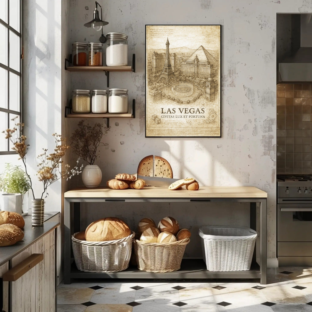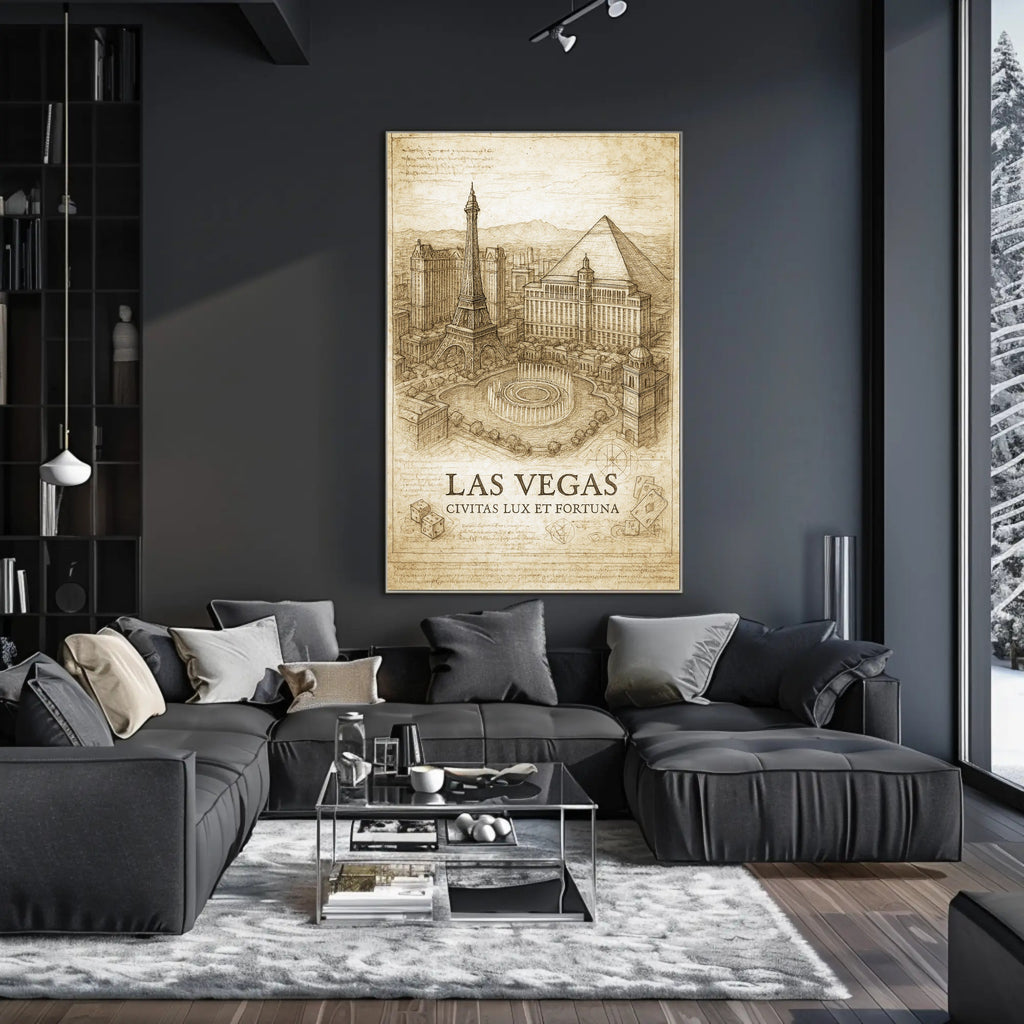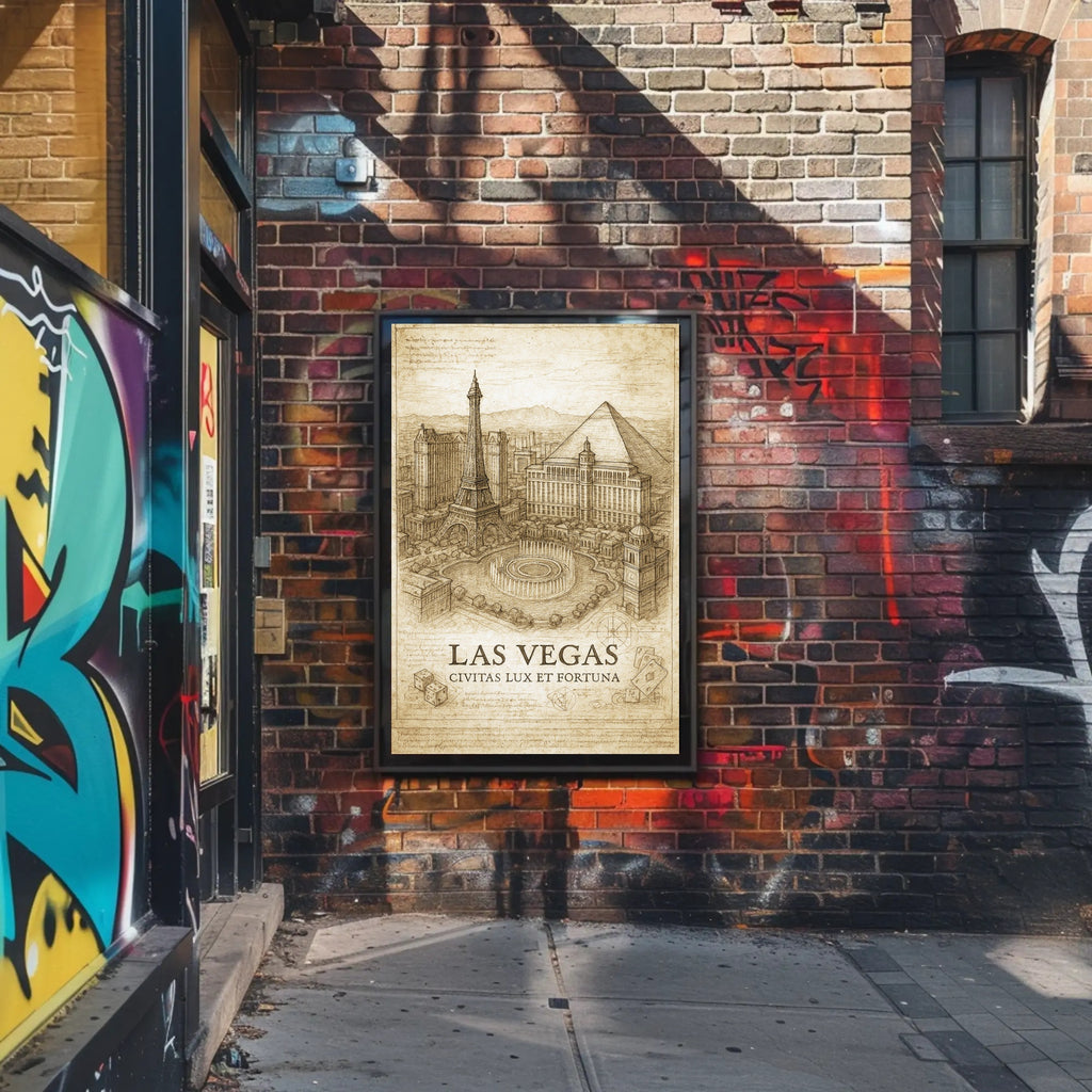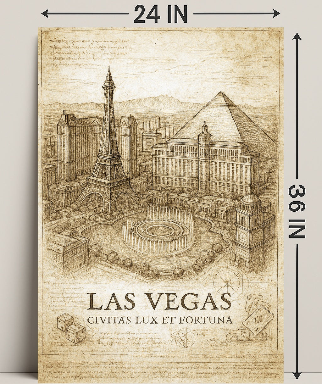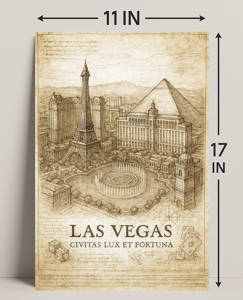 Bring the glamour and mystery of the Las Vegas Strip into your home with the Las Vegas Civitas Lux et Fortuna Poster by PosterGoat — a sepia-toned, vintage sketch-style art print that celebrates iconic landmarks and the city's spirit of luck and light.
