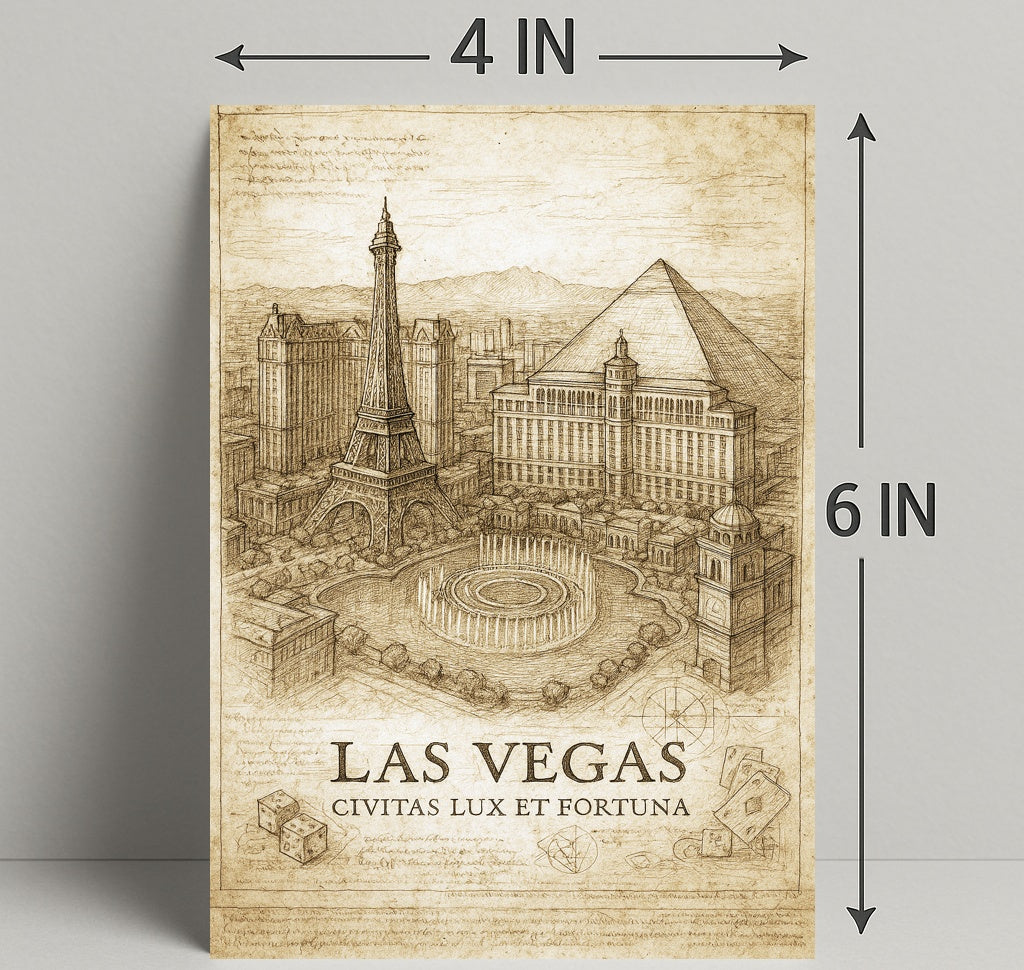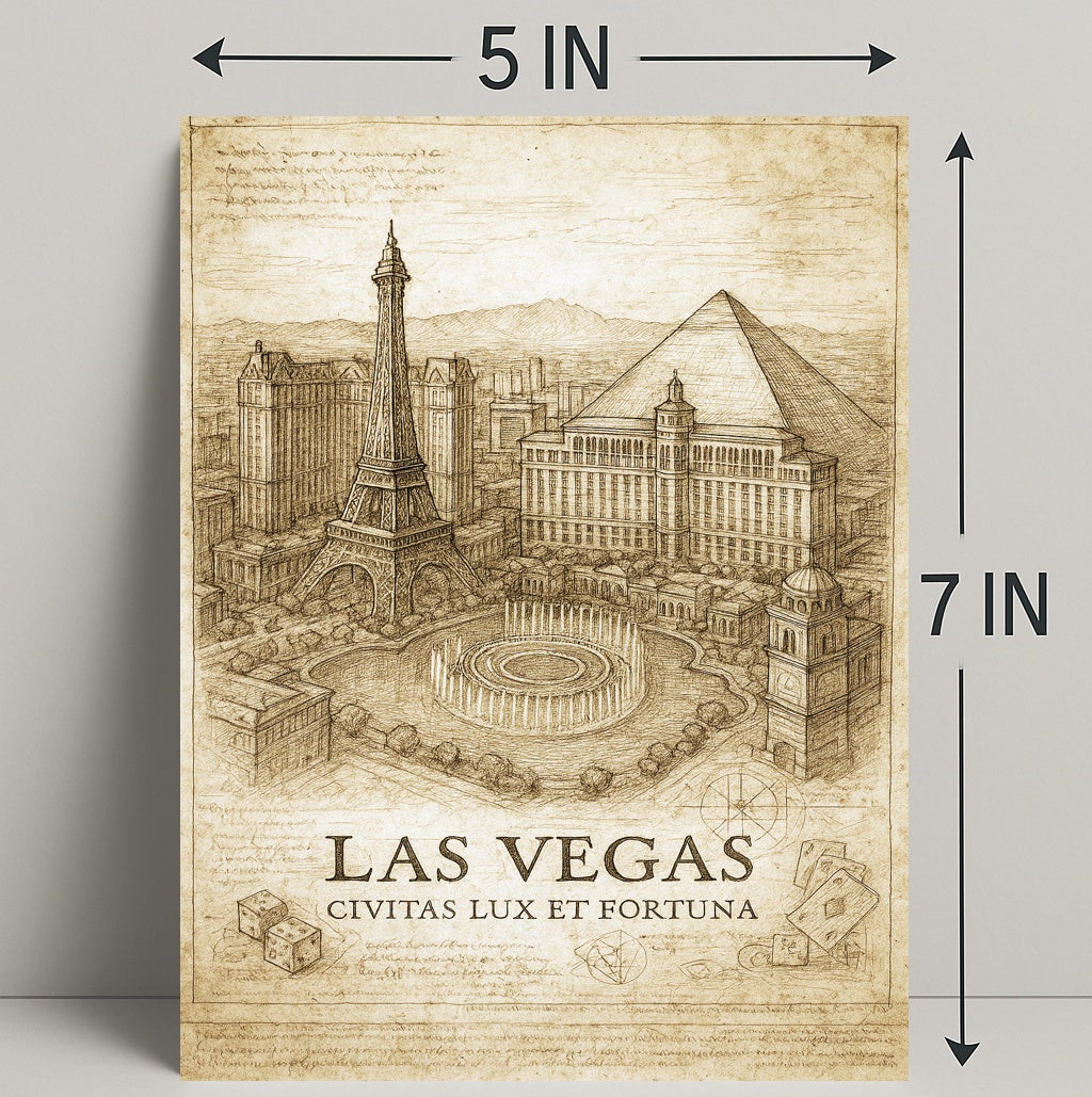 - Iconic imagery: Features detailed renderings of recognizable Vegas landmarks — a Paris-style tower, a pyramid hotel, and the circular fountain spectacle — framed by architectural sketches, dice and playing cards that hint at fortune and nightlife.