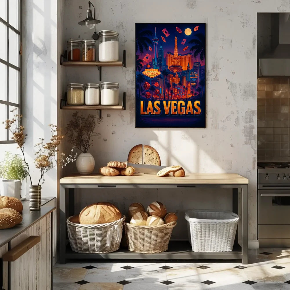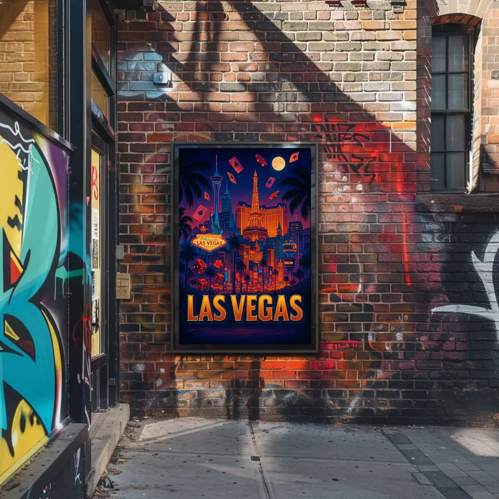 Experience the electrifying allure of Las Vegas with this dynamic poster, capturing the city's iconic nightlife. The artwork features famous landmarks such as the Eiffel Tower and the Statue of Liberty replicas, illuminated by vibrant neon lights. Surrounding these are symbols of the city's lively gaming culture — playing cards, dice, and poker chips — accentuating Vegas's status as a premier entertainment destination. The fusion of modern and retro elements, enhanced by bold colors and a neon glow, creates an atmosphere of excitement and adventure, offering a quintessential piece for fans of urban and cityscape art.