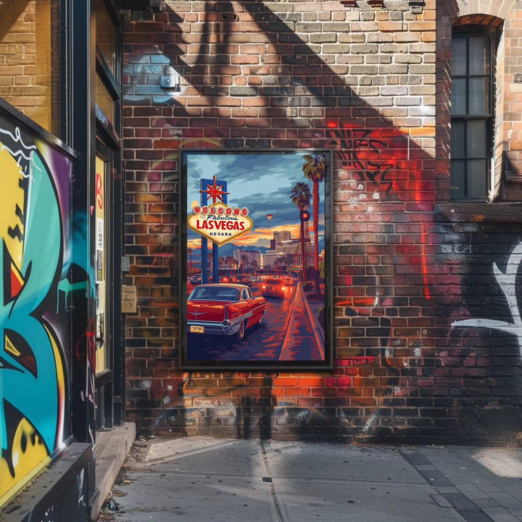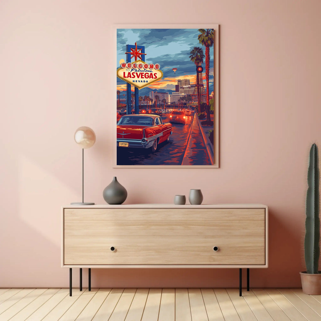 Las Vegas Retro Cityscape Travel Poster by PosterGoat brings vintage Vegas to your wall with bold sunset hues, palm-lined boulevards, and a classic mid-century car cruising past iconic neon silhouettes. This synthwave-inspired travel poster captures the nostalgic energy of the Strip—perfect for fans of retro travel art, vintage Las Vegas decor, and pop art cityscape prints.