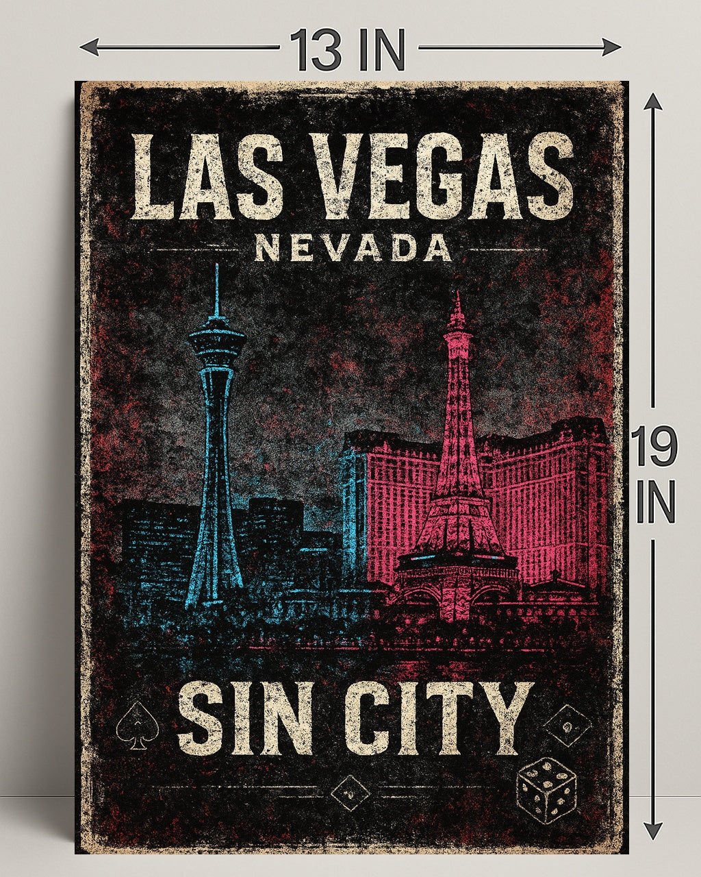 - Visual appeal: Bold typography reading “LAS VEGAS” and “SIN CITY” anchors the composition, while subtle gambling icons (dice, cards) reinforce the city’s legendary nightlife vibe.