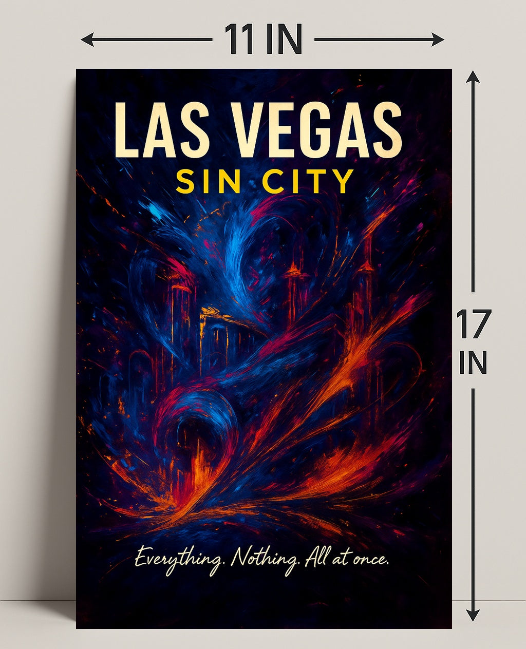 Everything. Nothing. All at once. — the hand-lettered tagline at the base captures Las Vegas’ paradoxical allure, making this print a conversation-starting focal point for living rooms, game rooms, offices, or hospitality spaces. The dramatic contrast and swirling motion make it ideal for travel lovers, art collectors, and anyone seeking bold wall art with a vintage-meets-modern vibe.