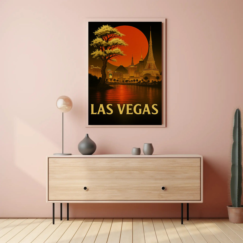 Capture the electric spirit of the Strip with the Las Vegas Skyline Poster from PosterGoat — a bold, minimalist piece of wall art that blends vintage travel-poster charm with modern décor sensibilities. Rich amber and gold tones define the skyline, casting a dramatic reflection across a serene body of water beneath a striking red sun. This eye-catching poster brings both warmth and sophistication to living rooms, offices, or hospitality spaces.