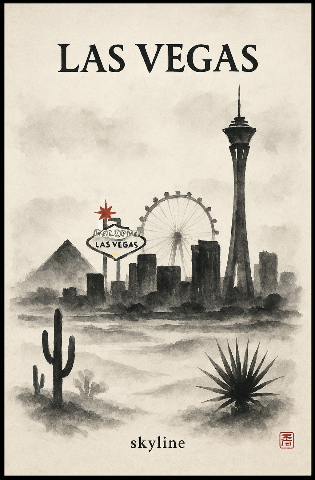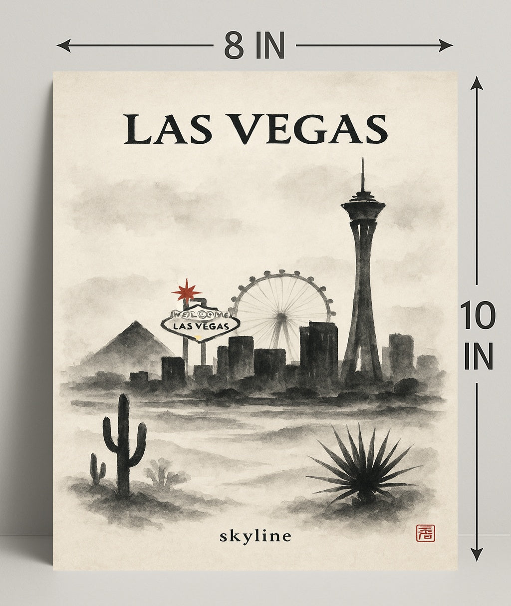 Bring the iconic energy of the Strip into your home with the Las Vegas Skyline Poster by PosterGoat. This minimalist, watercolor-style art print captures recognizable landmarks—the Stratosphere tower, the High Roller Ferris wheel, the famous "Welcome to Las Vegas" sign with its subtle red star—and frames them in a soft, monochrome desert scene accented by cacti and distant pyramids. Crafted for travel lovers, art collectors, and modern interiors, this poster blends scenic nostalgia with contemporary design.