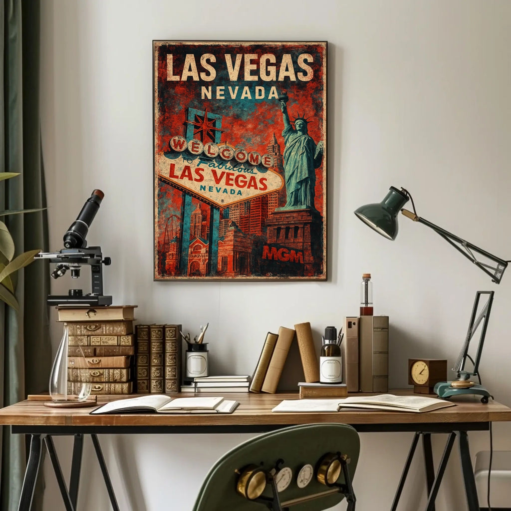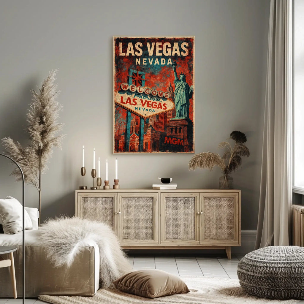 Set against a bold red and blue palette, the piece evokes nostalgia with distressed textures while the background bursts with the unforgettable Las Vegas skyline and architectural wonders, delivering a lively, iconic cityscape. Often regarded as America's playground, this poster is perfect for travel enthusiasts and vintage art lovers alike.