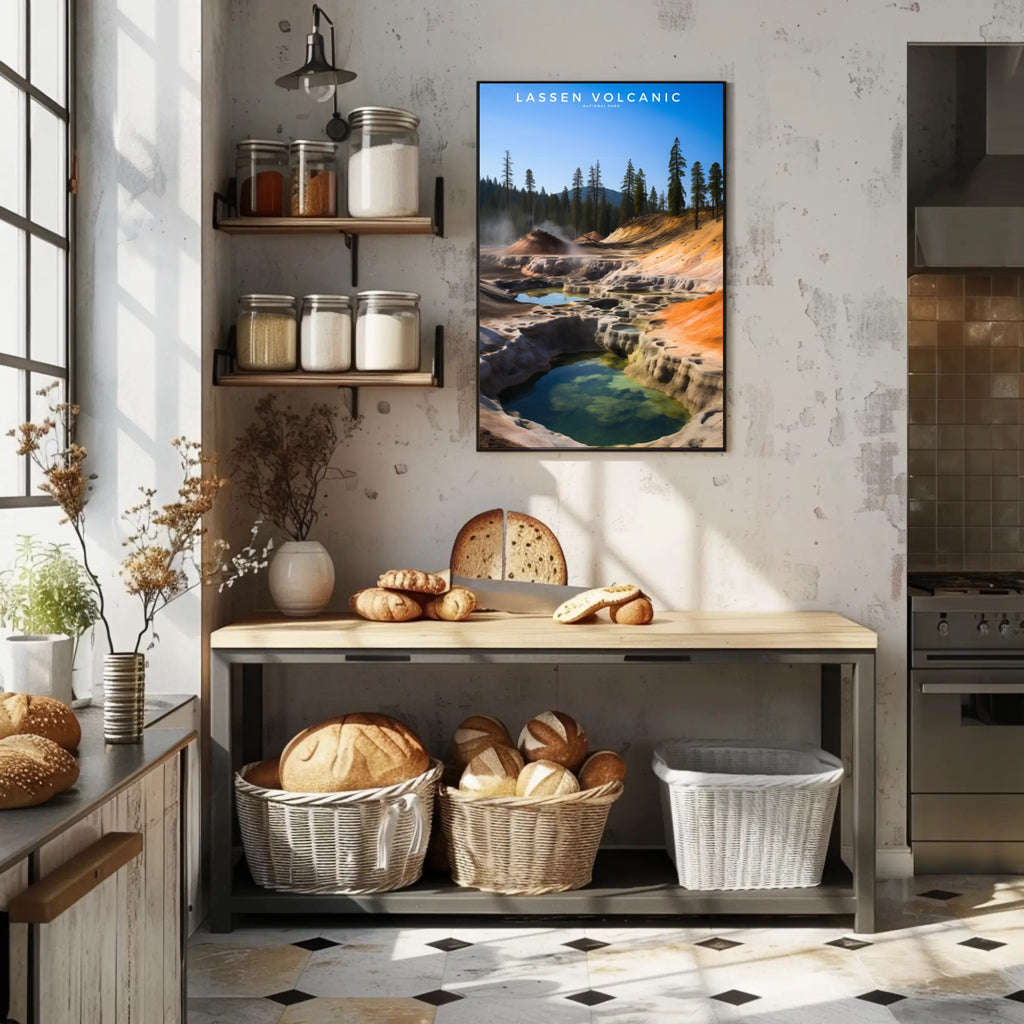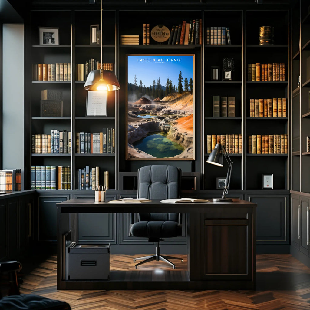 SEO Tags: lassen volcanic poster, national park travel poster, landscape wall art, geothermal pool poster, vintage travel print, PosterGoat poster, 18x24 travel art, minimalist nature print