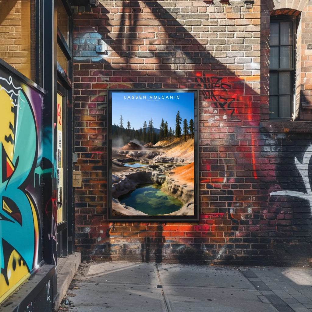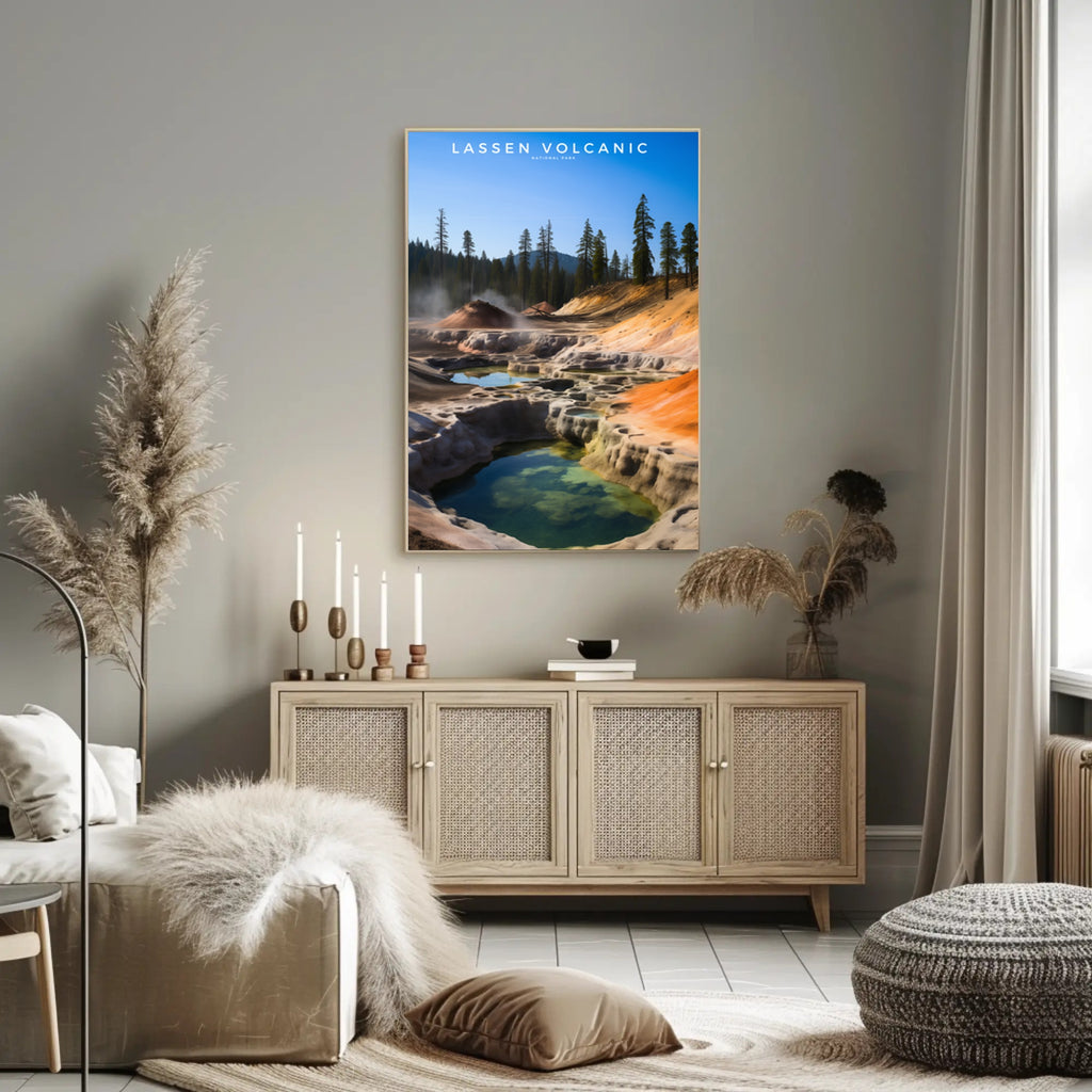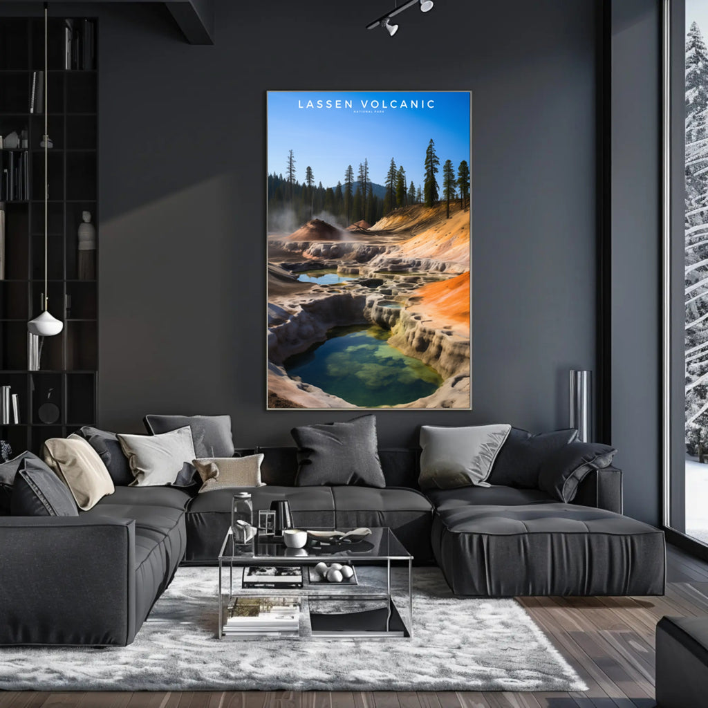 Bring the raw beauty of Lassen Volcanic National Park into your home with this high-impact travel poster from PosterGoat. Inspired by real-world geothermal terraces, steaming pools and towering pine silhouettes, this art print blends vivid color and minimalist composition to create a striking focal point for living rooms, offices, or entryways.