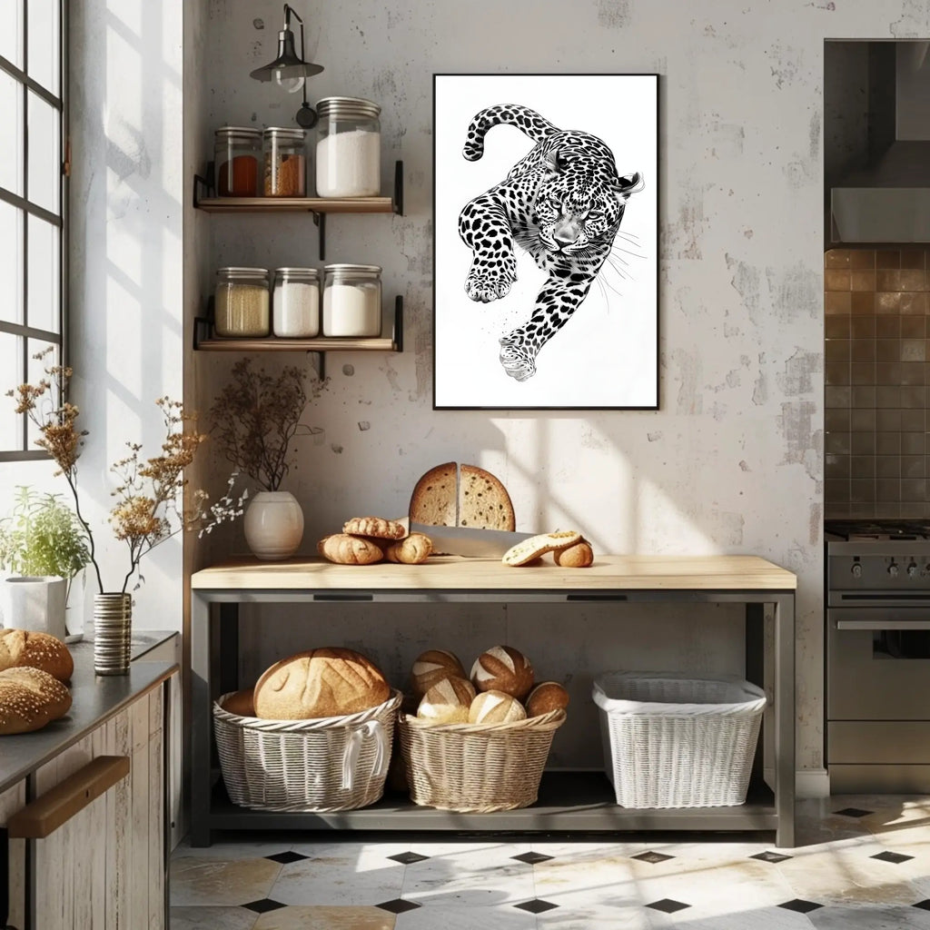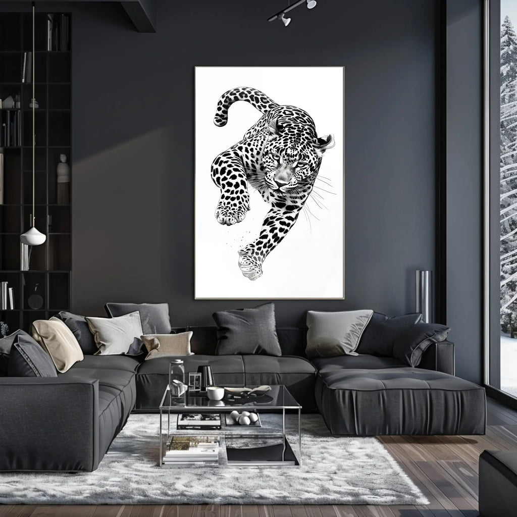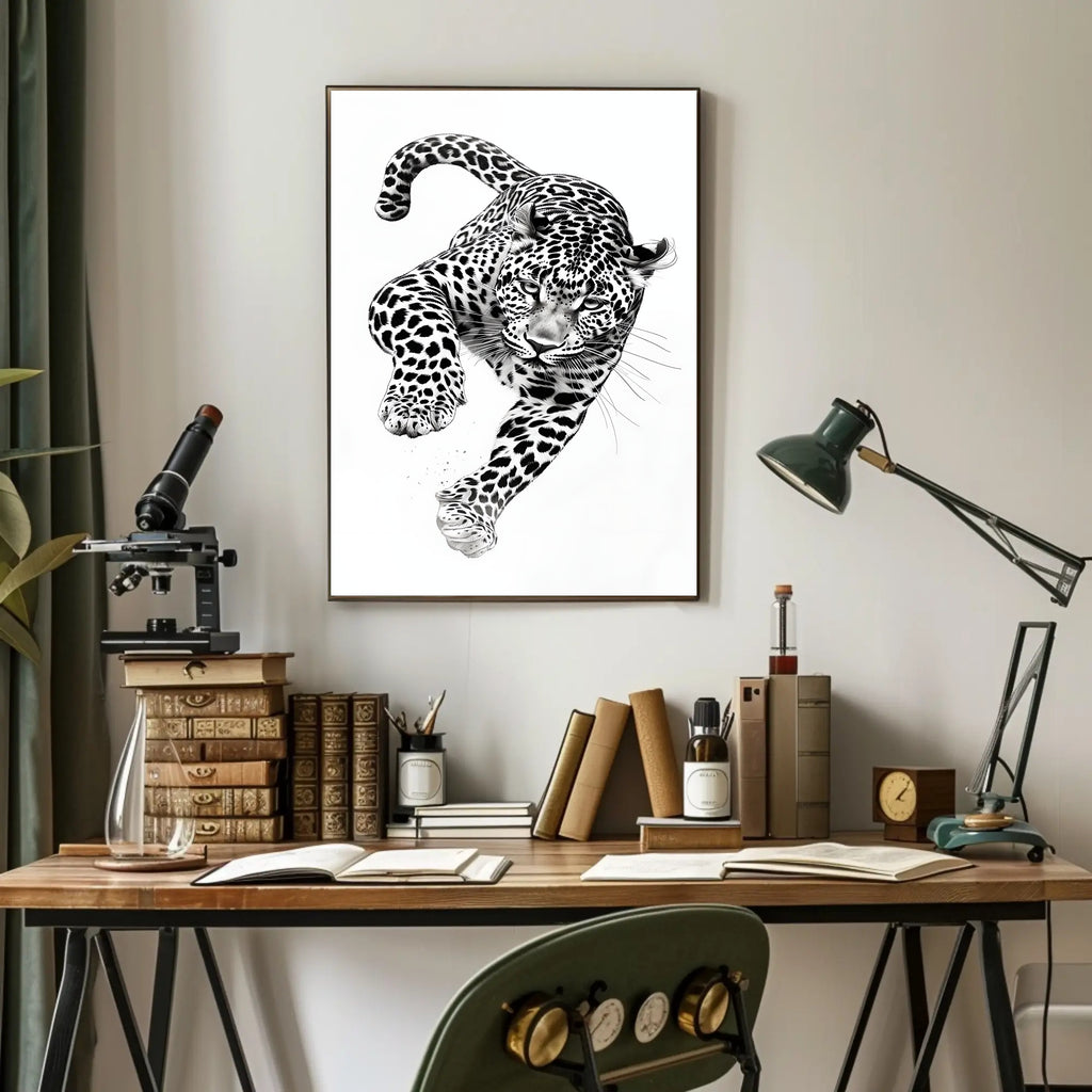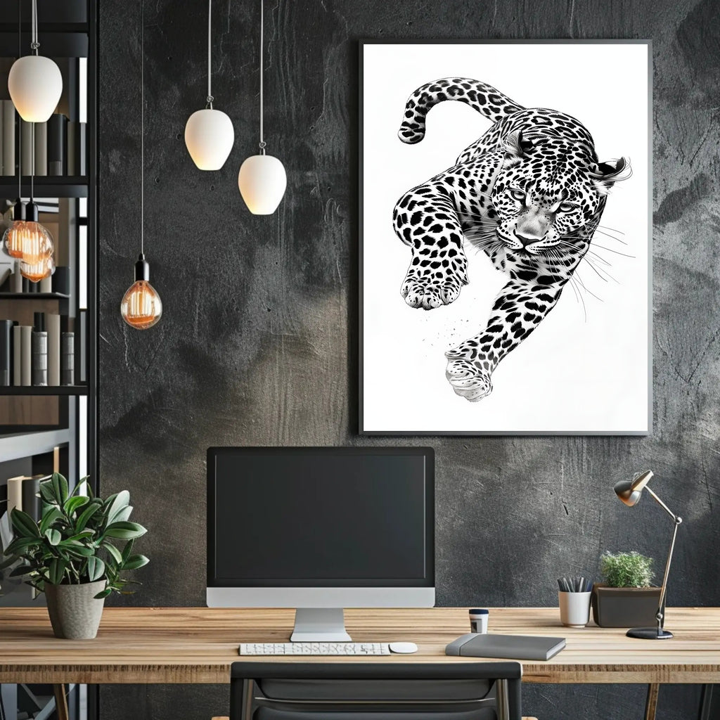 Designed with exceptional attention to detail, the illustration emphasizes the leopard’s dynamic leap, powerful musculature, and the textured pattern of its spots. The clean white background and bold inkwork create dramatic visual impact while keeping the piece versatile for a range of interiors, from Mid-Century Modern to grunge-inspired spaces.