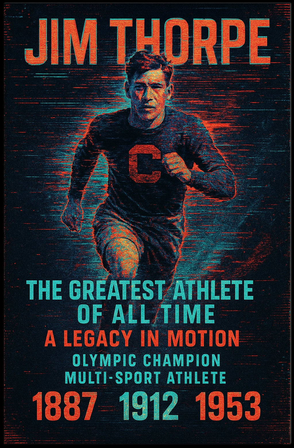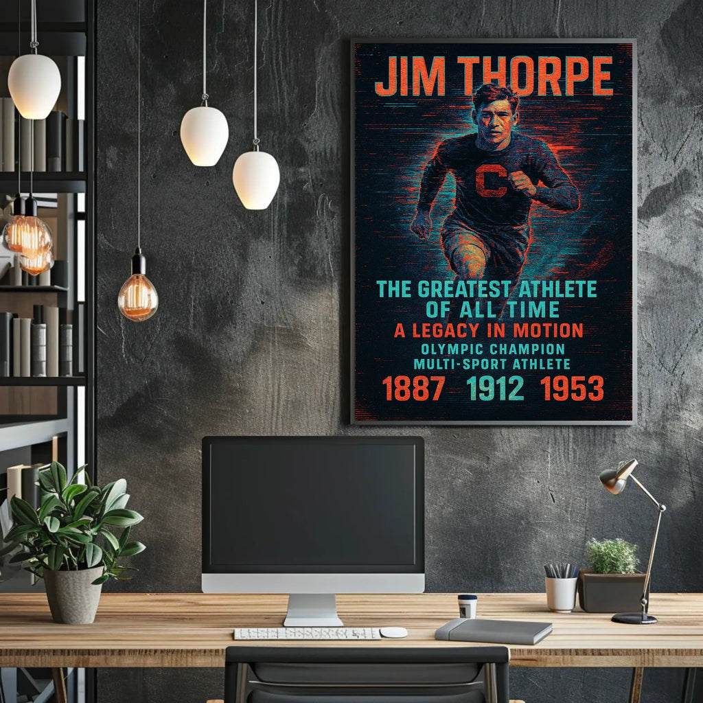 Immerse yourself in the enduring legend of Jim Thorpe with this striking poster that captures the spirit of a multi-sport Olympic champion hailed as the greatest athlete of all time. Spanning 1887 to 1953, the design celebrates a life of triumph, resilience, and trailblazing versatility, making it a focal point for sports lovers and history enthusiasts alike.