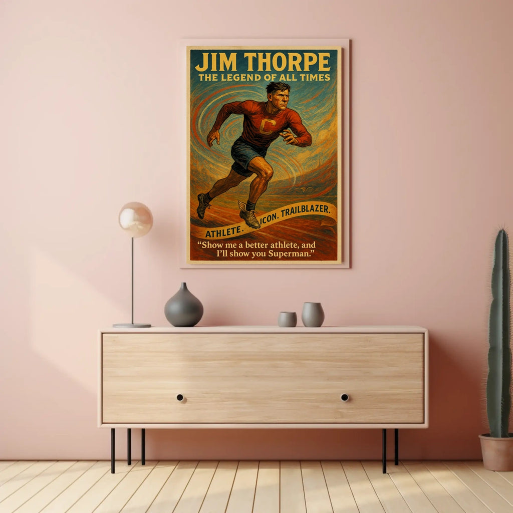 Celebrate the unparalleled legacy of Jim Thorpe with this striking poster. Perfect for sports enthusiasts and history buffs, it captures his indomitable spirit and extraordinary achievements, making it an inspiring addition to any space.