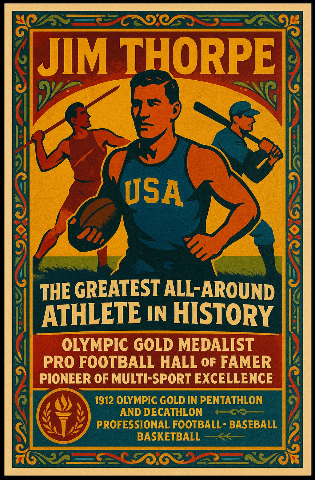 This vibrant poster honors a true sports legend, celebrating a career defined by discipline, drive, and multi-sport excellence. It captures the energy of elite competition and the achievement of an Olympic gold medalist in pentathlon and decathlon, making fans and history buffs feel connected to a lasting athletic legacy.