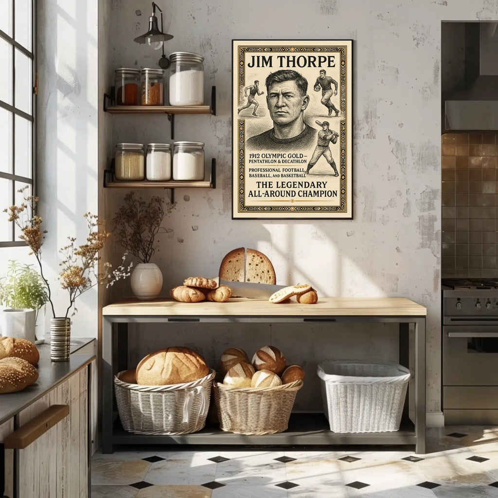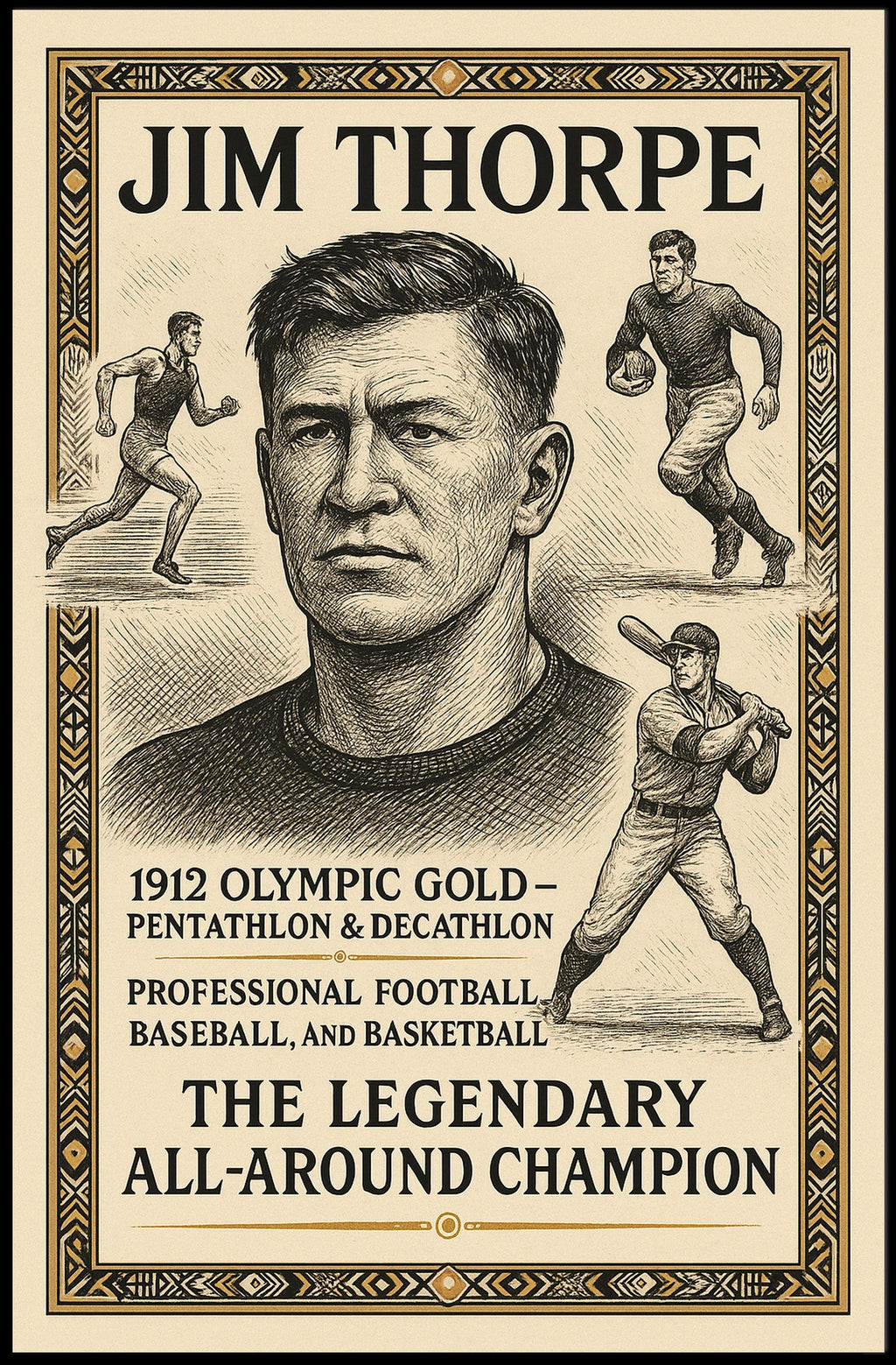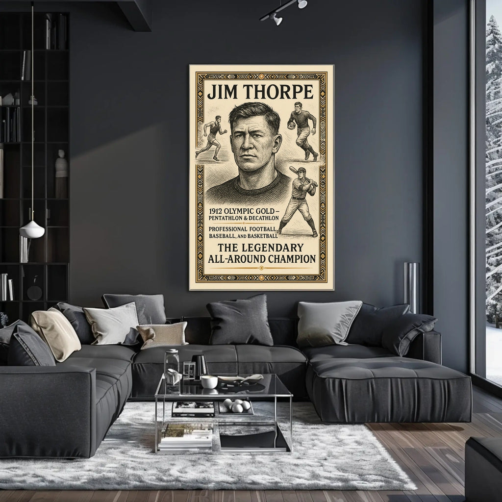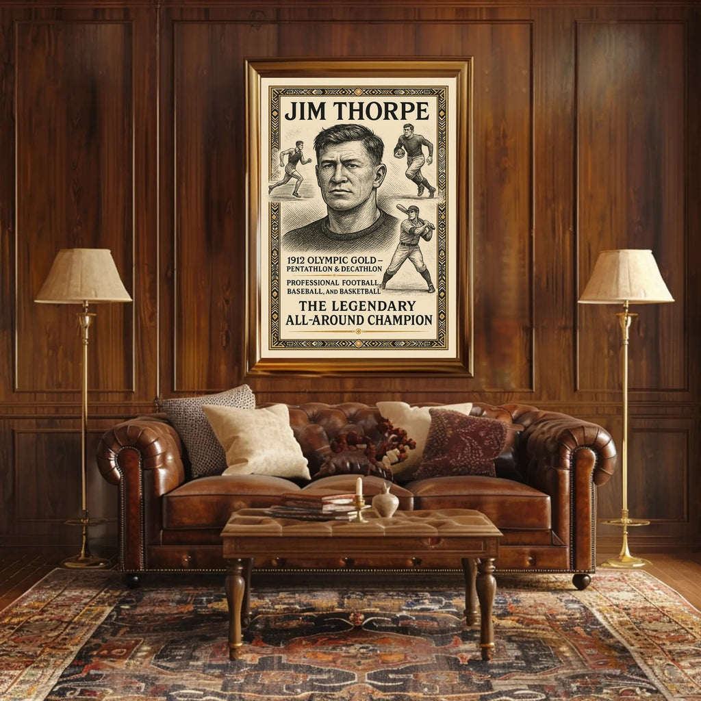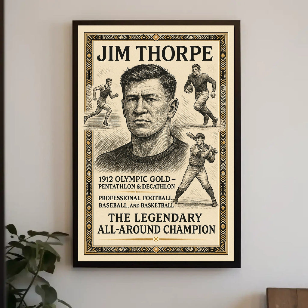 Celebrate the legendary versatility of a 1912 Olympic gold medalist with this striking poster. Honoring a talent who shined in pentathlon and decathlon while excelling in professional football, baseball, and basketball, this piece captures the enduring spirit of multi-discipline achievement—perfect for sports fans, history buffs, and bold wall art alike.