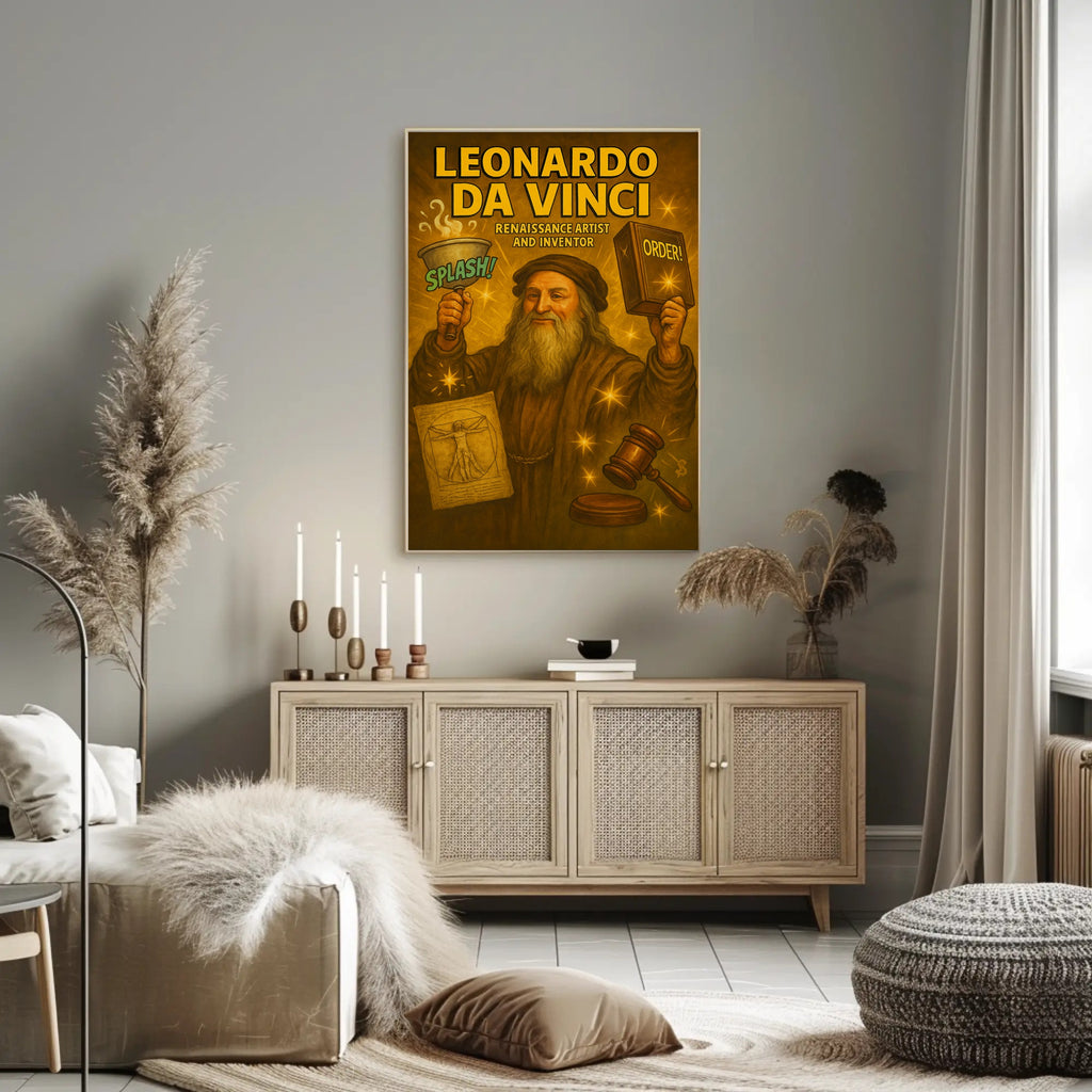 Bring Renaissance genius into your home with the Leonardo da Vinci – Renaissance Artist and Inventor Poster from PosterGoat. This richly illustrated art print blends vintage poster charm and modern minimalist styling, rendered in warm golden-brown tones that draw the eye and enrich any room in your home or office.