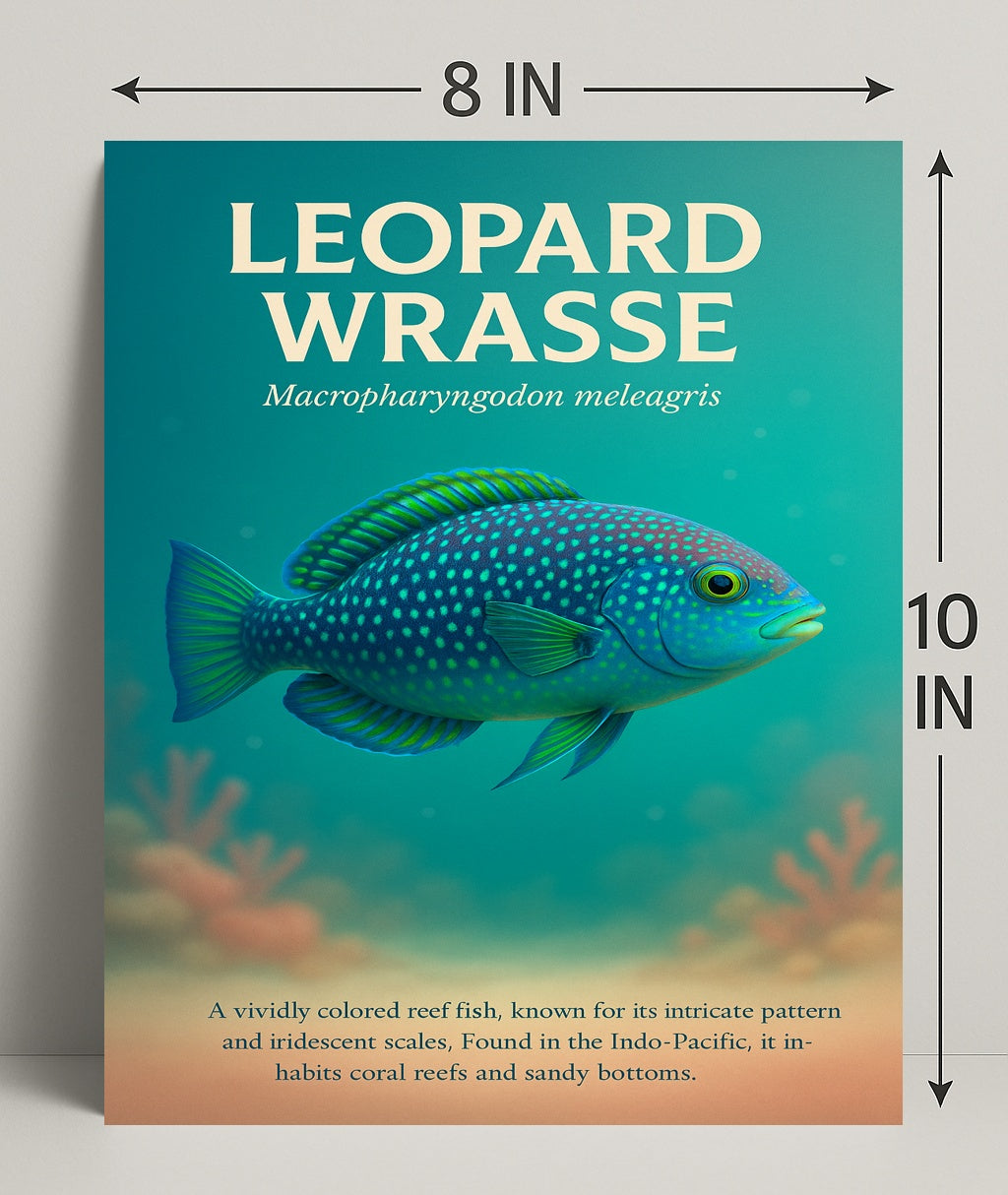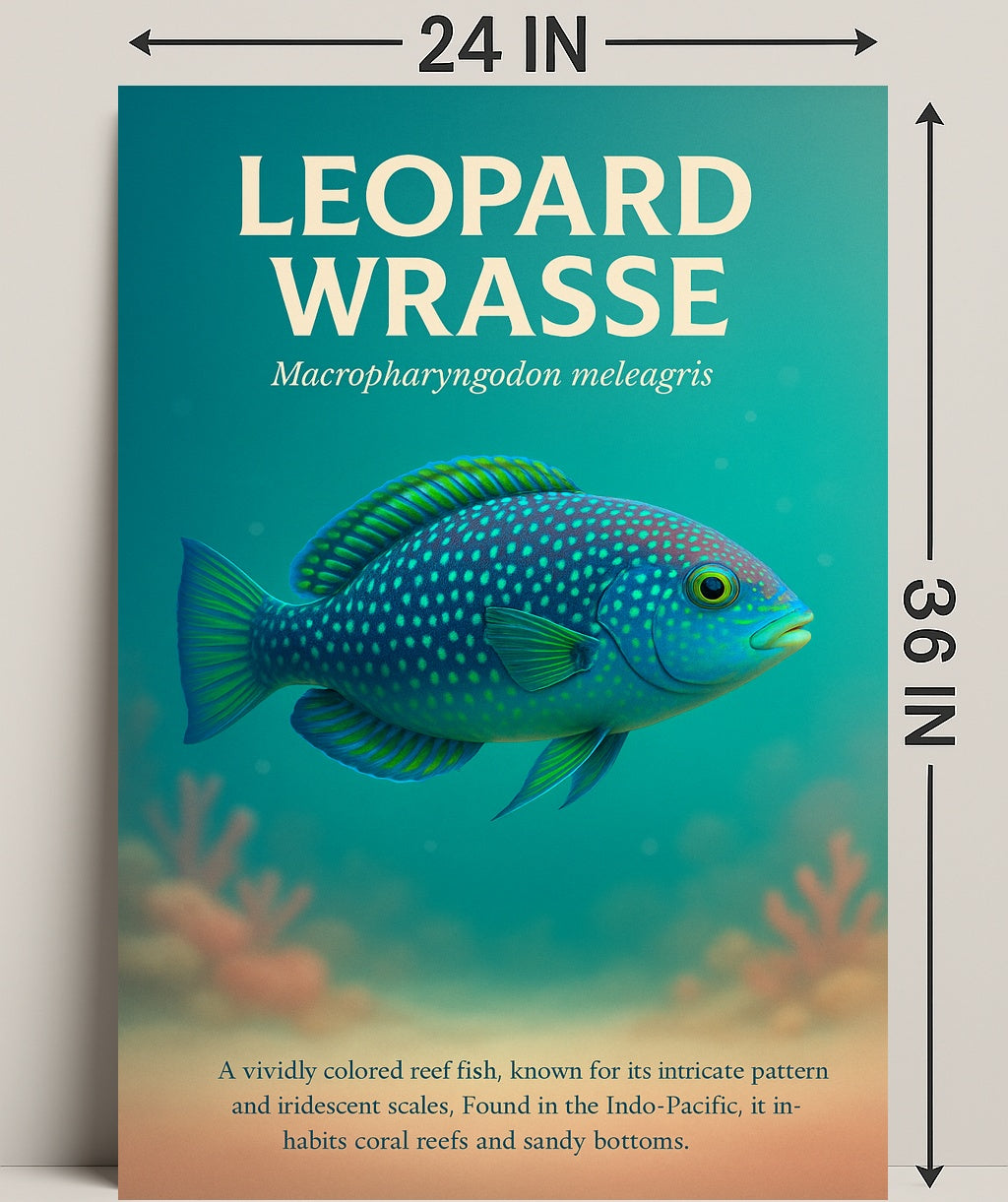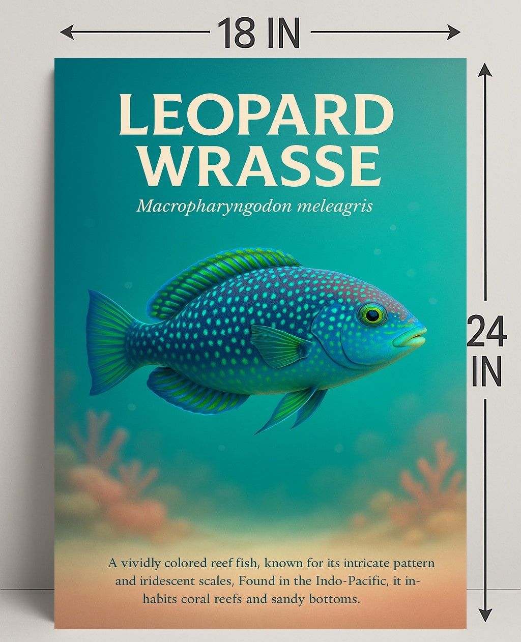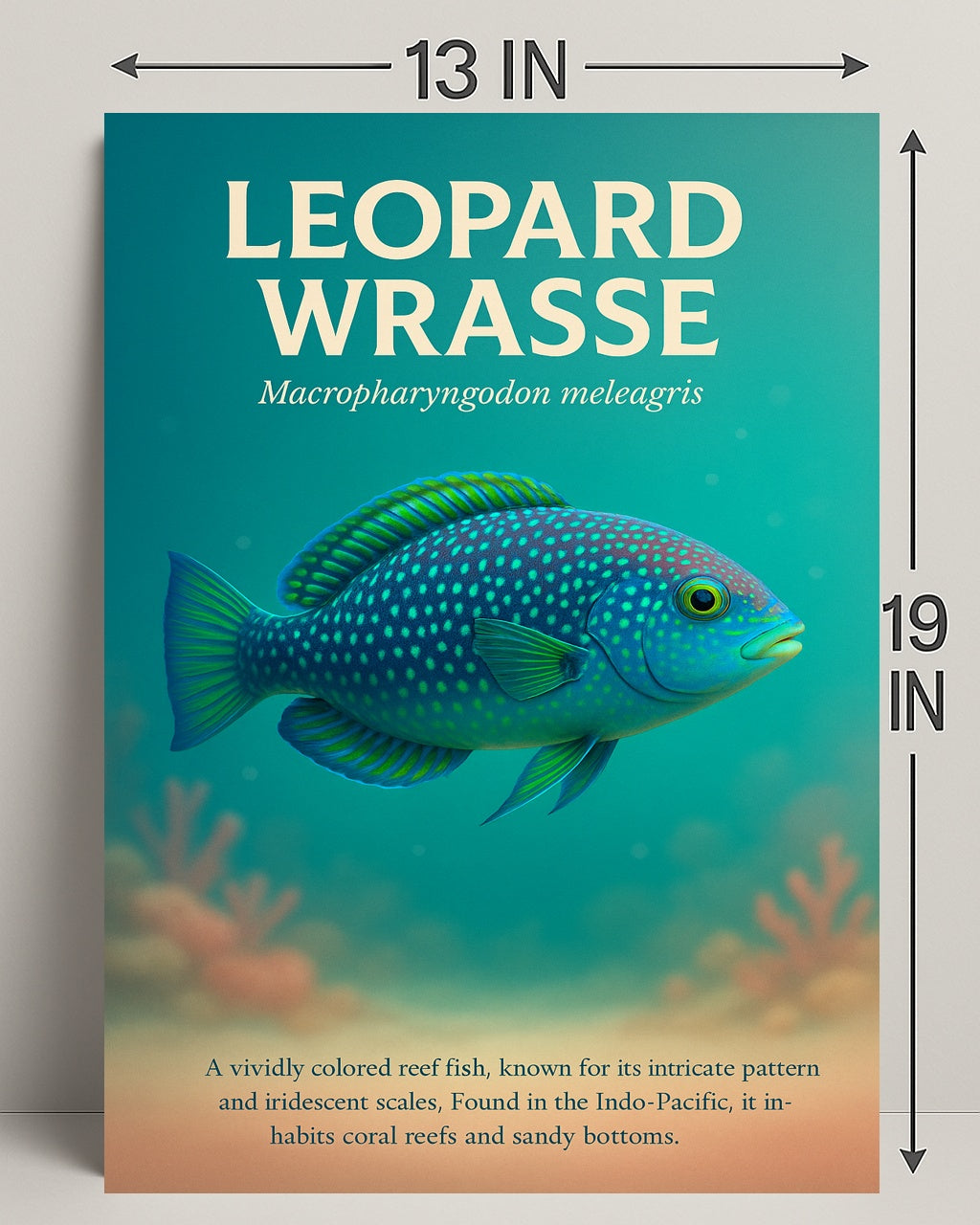- Brilliant Visuals: Featuring a vividly colored design, this poster captures the intricate patterns and iridescent scales of the Leopard Wrasse.