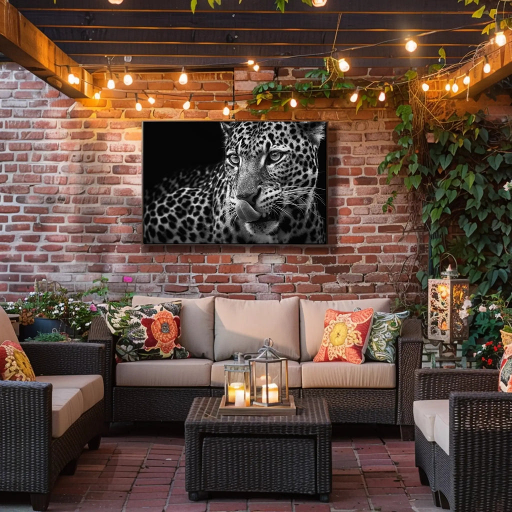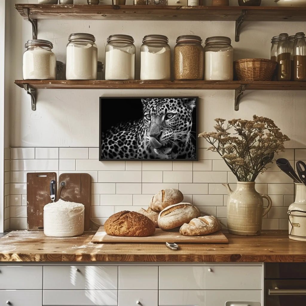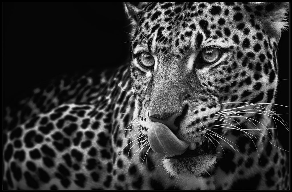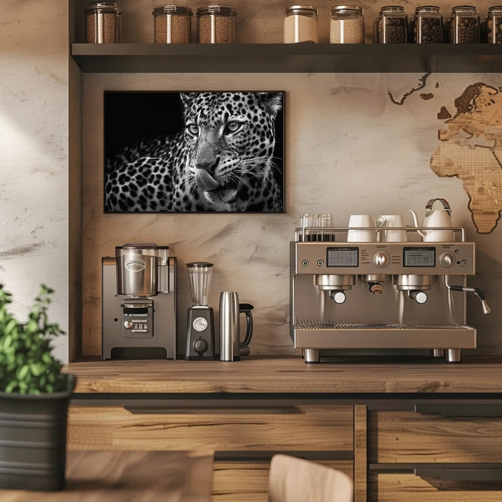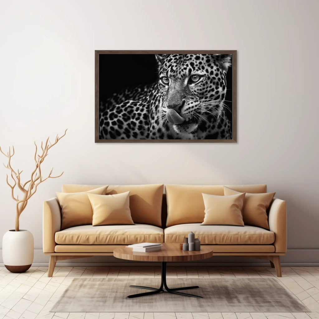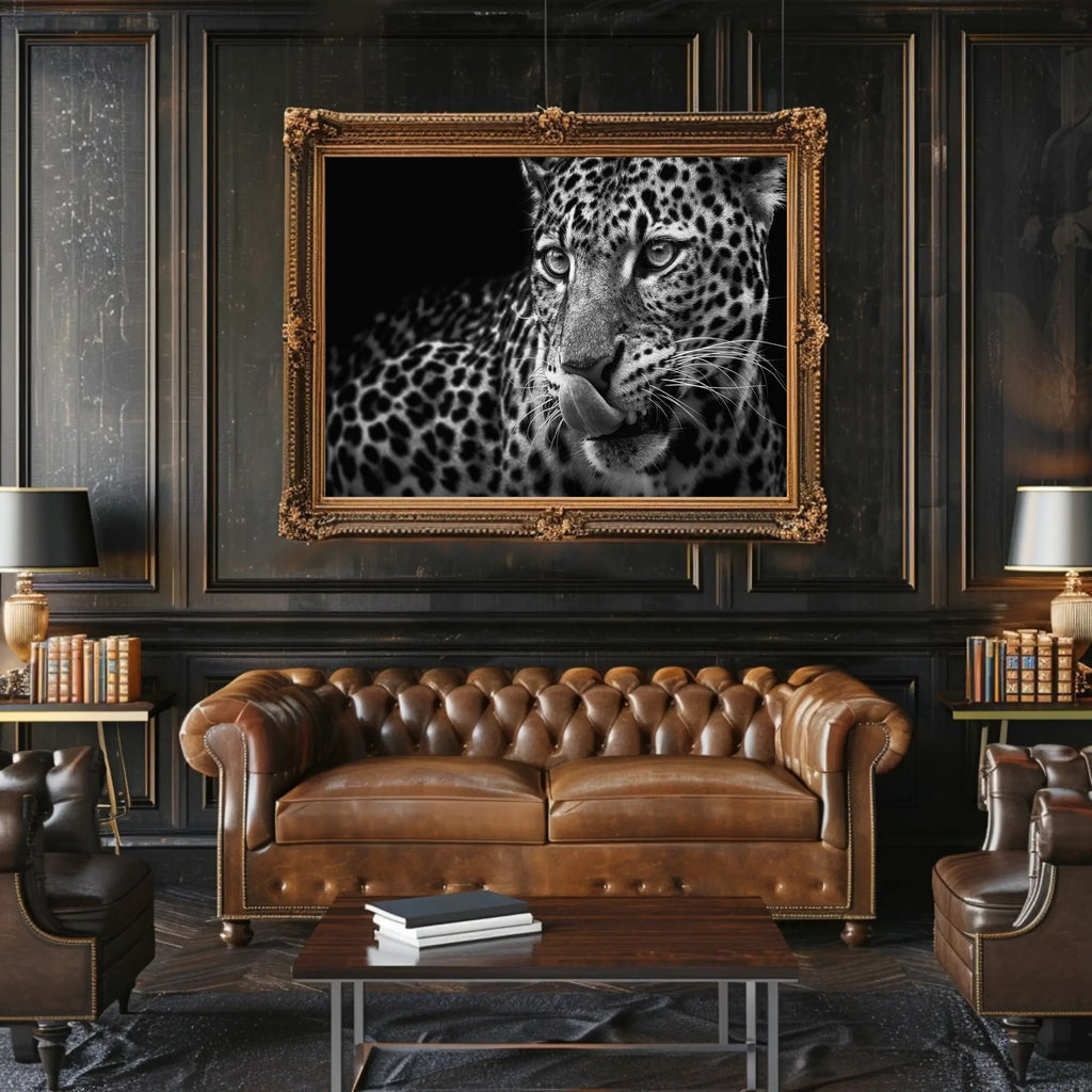 This captivating poster captures the wild beauty and alluring presence of the leopard in an exquisite portrait that will elevate any space. Showcasing the leopard's intense gaze and the exquisite mark of its spots, the artwork draws viewers in with the life-like texture of its fur. The included detail of its flicking tongue evokes movement and excitement, highlighting the majestic and untamed nature of these breathtaking creatures. Perfect for anyone who admires the wonders of wildlife and appreciates fine art, this poster brings an authentic and dynamic touch to living spaces, offices, or creative studios.