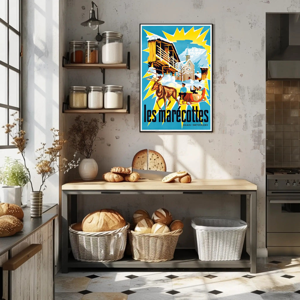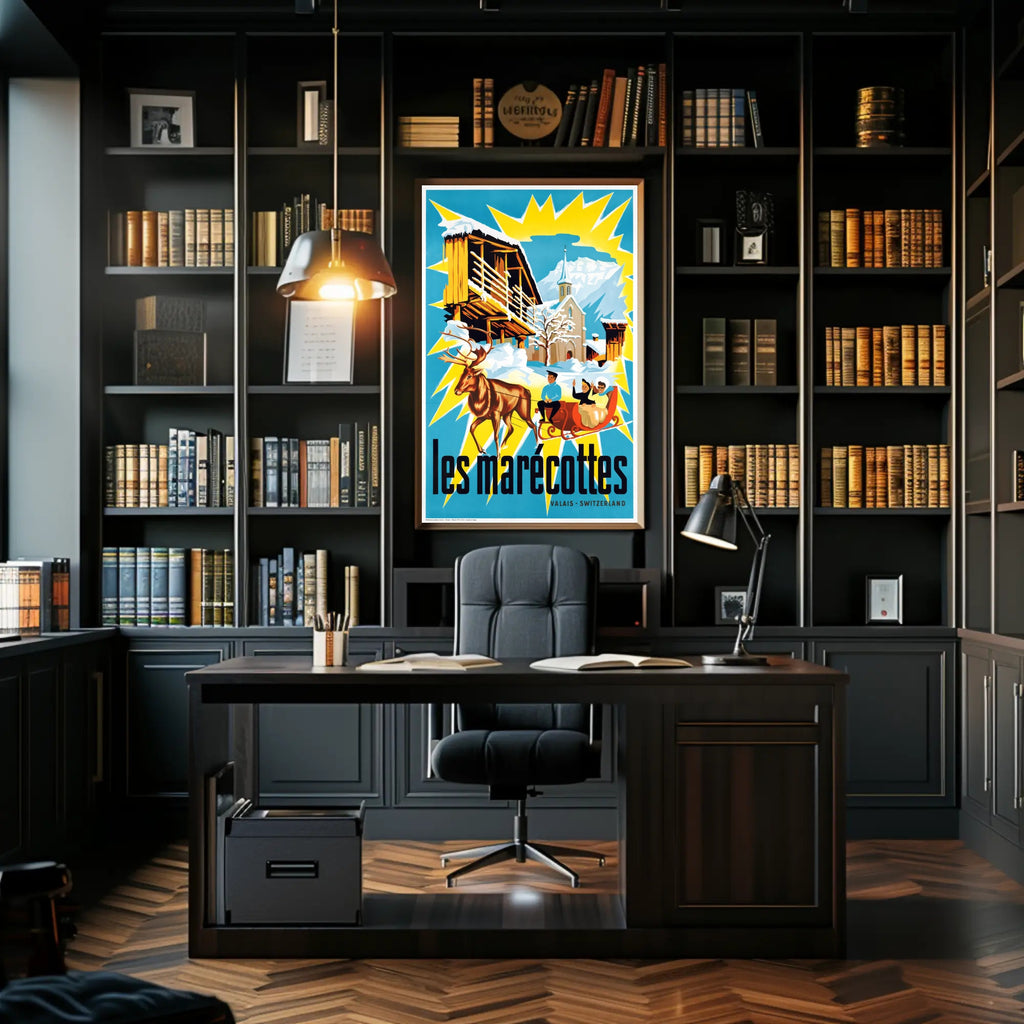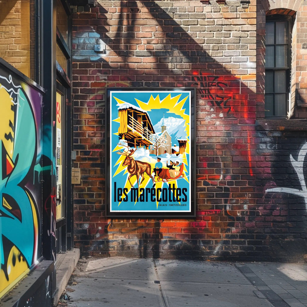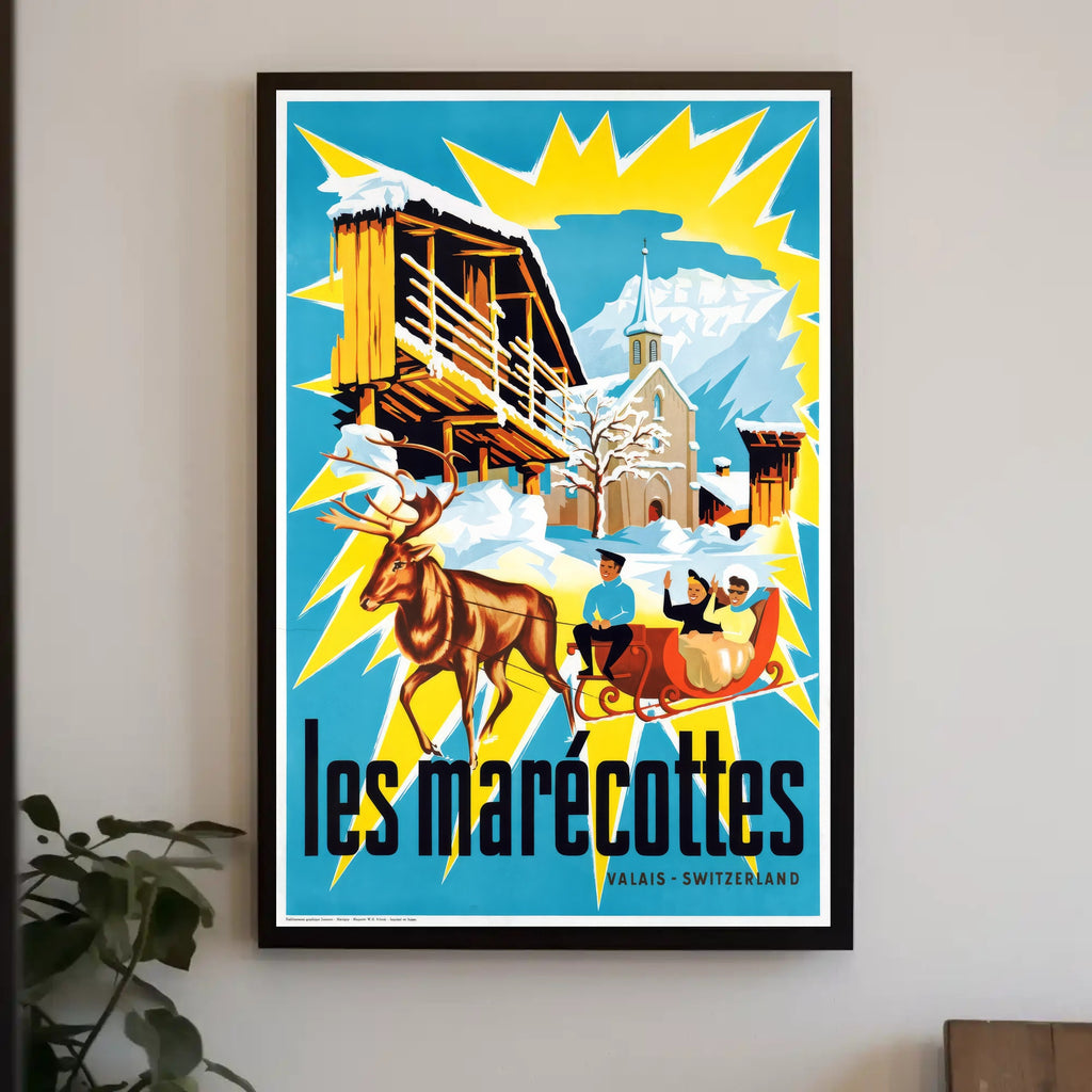 Transport yourself to the enchanting winter wonderland of Les Marécottes in Valais, Switzerland, with this vintage-style travel poster. Immerse yourself in the picturesque scenery of snow-capped mountains sheltering a quaint wooden chalet and a charming church with a steeple. The idyllic scene captures the joyful ambiance of winter, with a reindeer-pulled sleigh carrying warmly-clad travelers across a festive landscape. This artwork, reminiscent of mid-20th century travel advertisements, features vibrant colors and bold outlines, while a radiant sunburst adds an inviting allure. Perfect for celebrating Swiss winter beauty and adventurous holiday escapes.