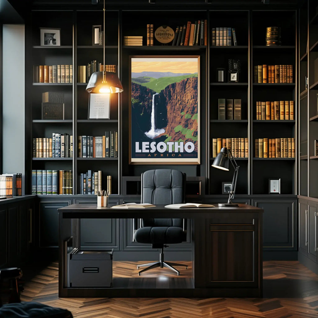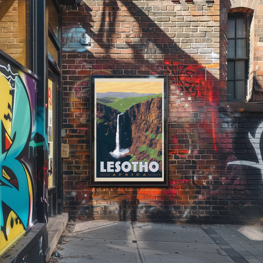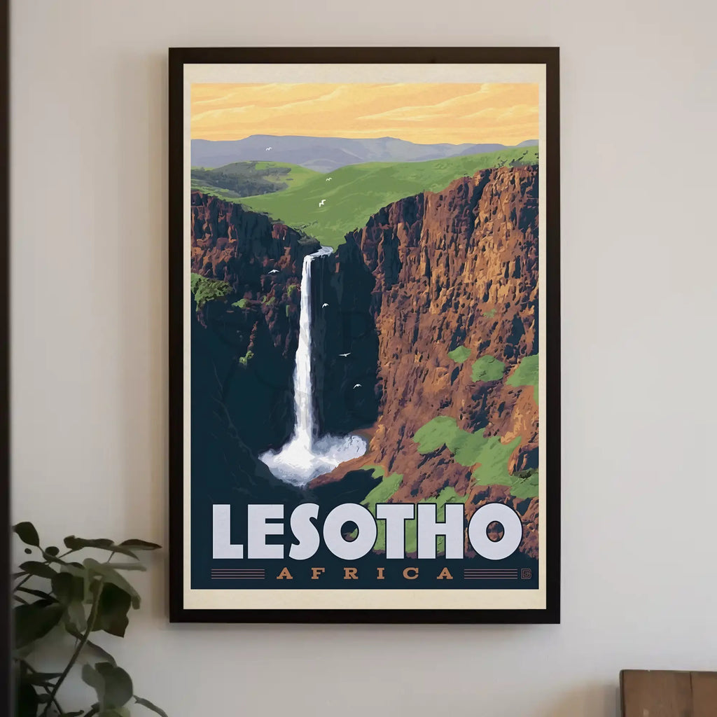 Capture the essence of adventure and natural beauty with this stunning vintage travel poster. Featuring a breathtaking view of a waterfall cascading down the cliffs of a canyon in Lesotho, Africa, this poster embodies the spirit of exploration. The bold letters "LESOTHO" and "AFRICA" stand out, inviting you to discover the untouched landscapes of this beautiful country. With a design inspired by classic travel posters, it uses vibrant earthy tones and simplified shapes to create a sense of wanderlust. Perfect for those who appreciate the allure of distant lands and the thrill of adventure.