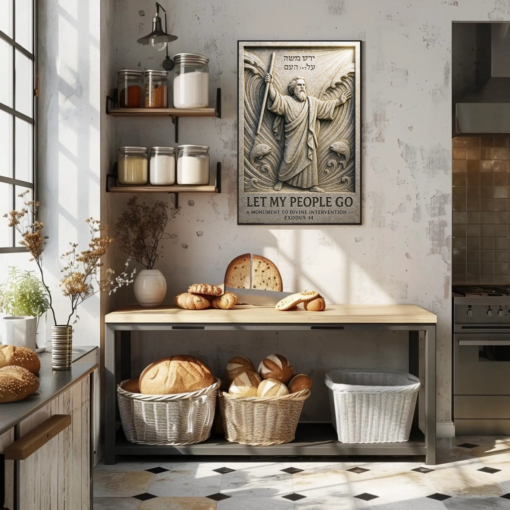 Let My People Go — A Monument to Divine Intervention by PosterGoat is a striking 18x24 poster inspired by classic stone bas‑relief sculptures. Rendered with meticulous texture and depth, the print recreates the dramatic moment from Exodus 14: Moses parting the sea, framed by swirling waves, twin fish motifs and bold Hebrew lettering — an evocative piece for any home decor collection.