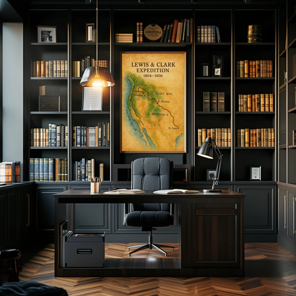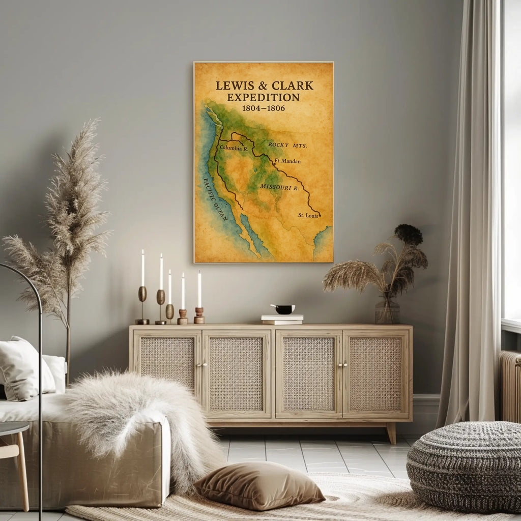 Discover the adventurous spirit of early America with this stunning poster showcasing the Lewis & Clark Expedition, an iconic journey that helped shape the United States. This historical map poster intricately details the exploration route from 1804 to 1806, vividly highlighting landmarks like the Columbia River, Missouri River, and Rocky Mountains. The rich color palette and precise cartography not only educate but also transform any space into a homage to American exploration history. Ideal for historians, educators, or map enthusiasts, this artwork blends educational value with a touch of nostalgia, making it a unique decorative choice.