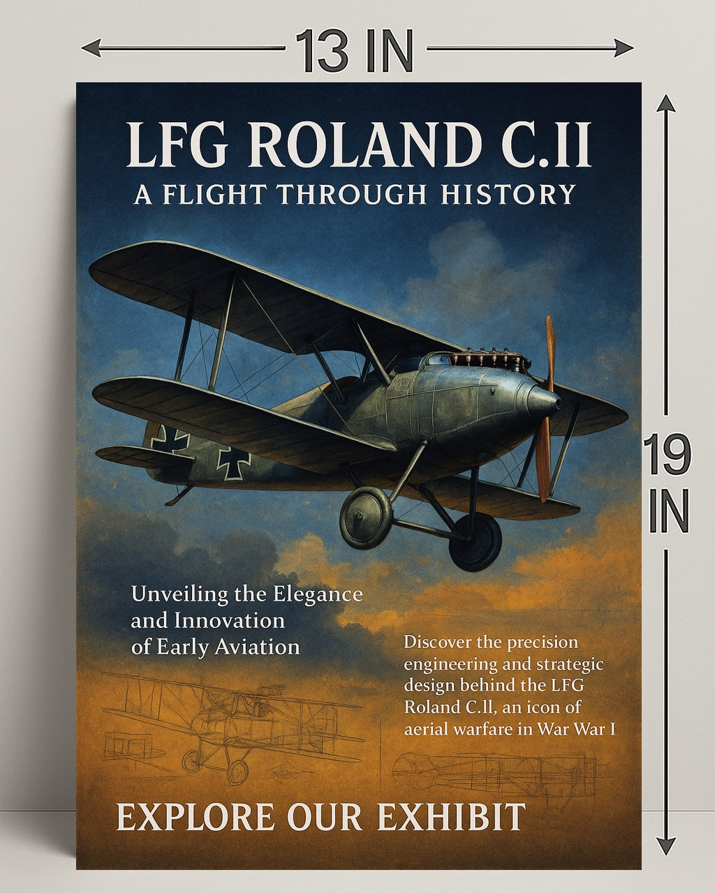 LFG Roland C.II — A Flight Through History by PosterGoat brings a striking piece of aviation heritage to your walls. This poster features a richly detailed illustration of the iconic World War I biplane soaring against a dramatic twilight sky, accented with warm, vintage-toned clouds and subtle blueprint sketches at the lower edge for a museum-exhibit feel. The bold serif title and classic typography create an authentic, collectible look perfect for home, office, or gallery-style decor.