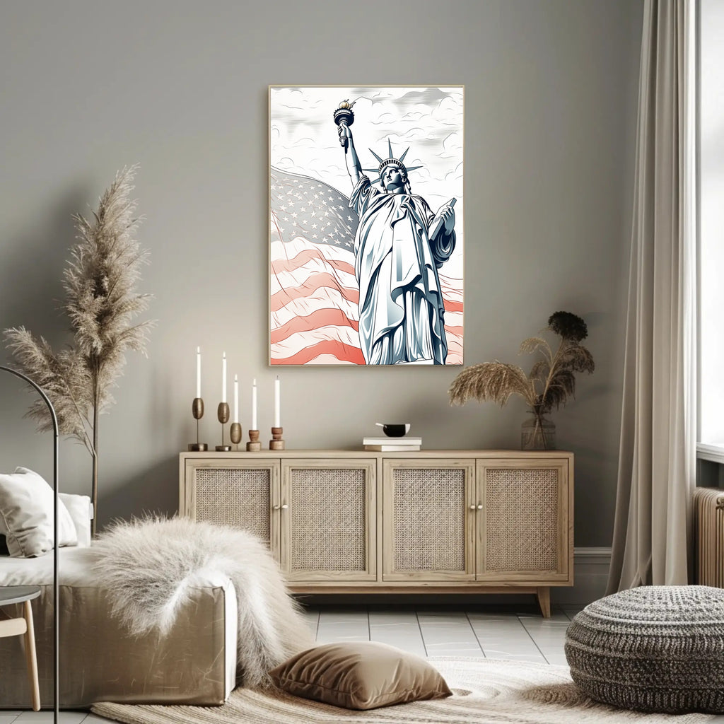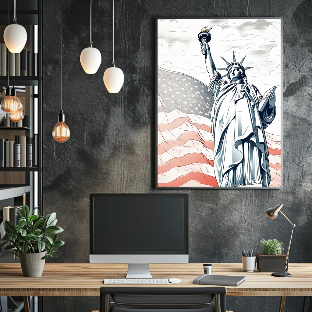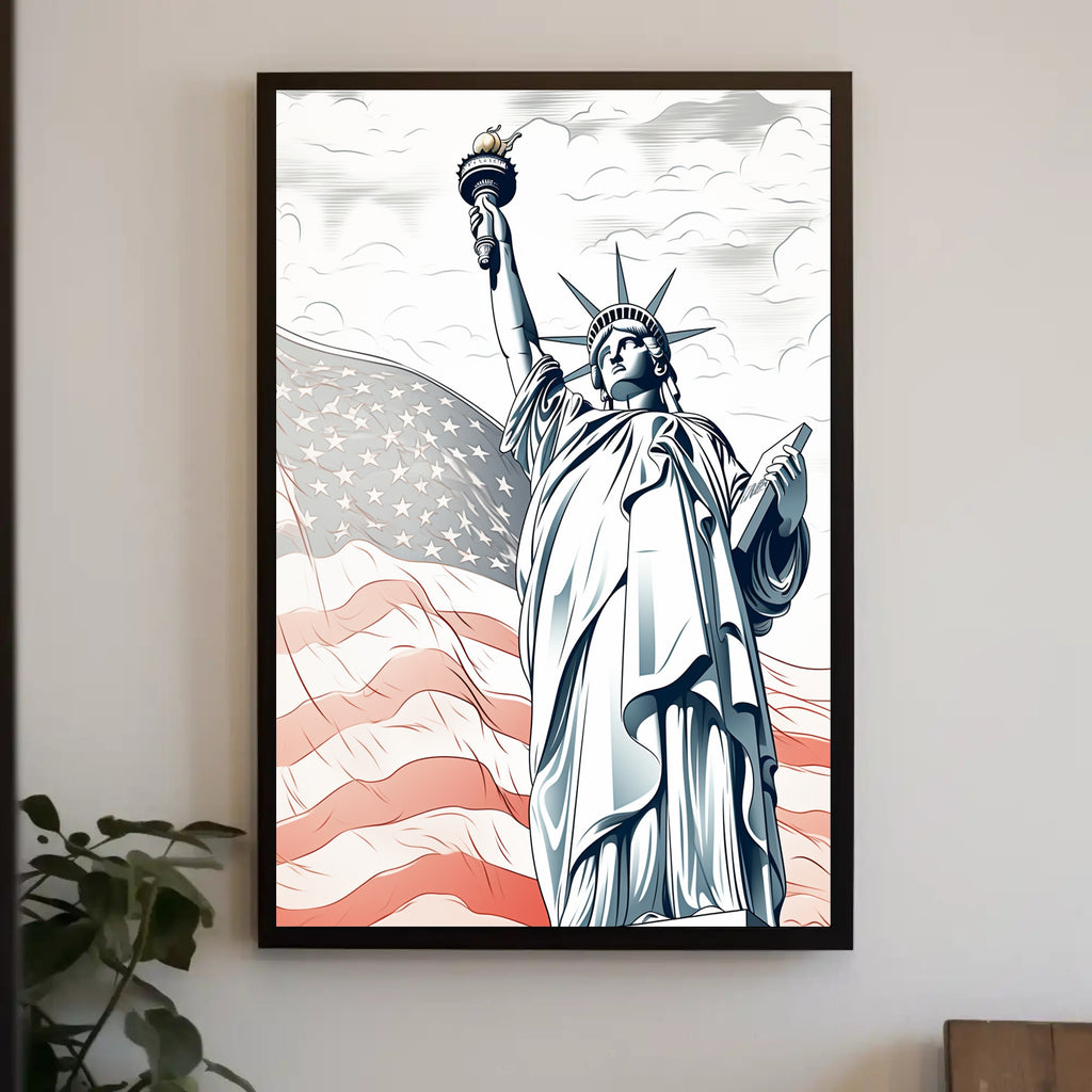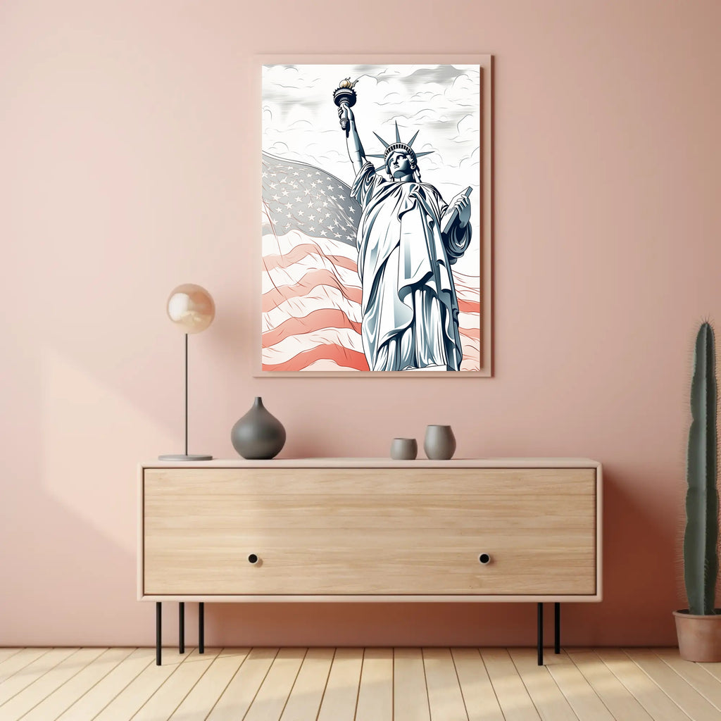 Celebrate freedom with striking wall art. The Liberty And Freedom Poster from PosterGoat transforms any room into a thoughtful, patriotic focal point—featuring a stylized, high-contrast depiction of the Statue of Liberty set against a sweeping American flag and soft cloudline accents. Its minimalist, artful aesthetic pairs perfectly with modern and classic interiors alike.