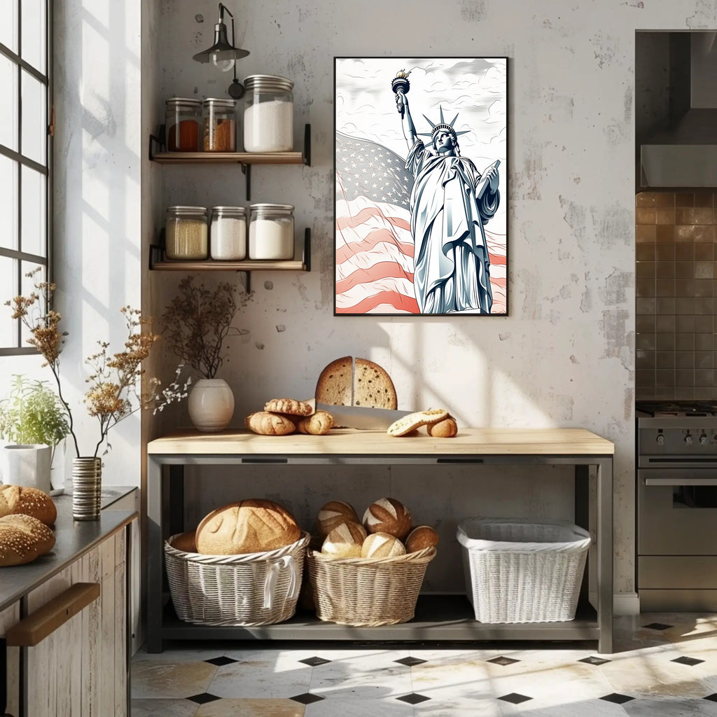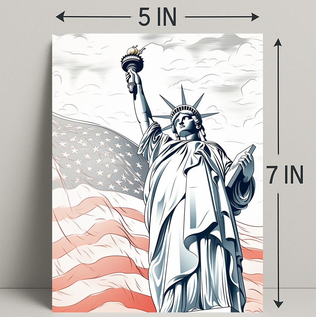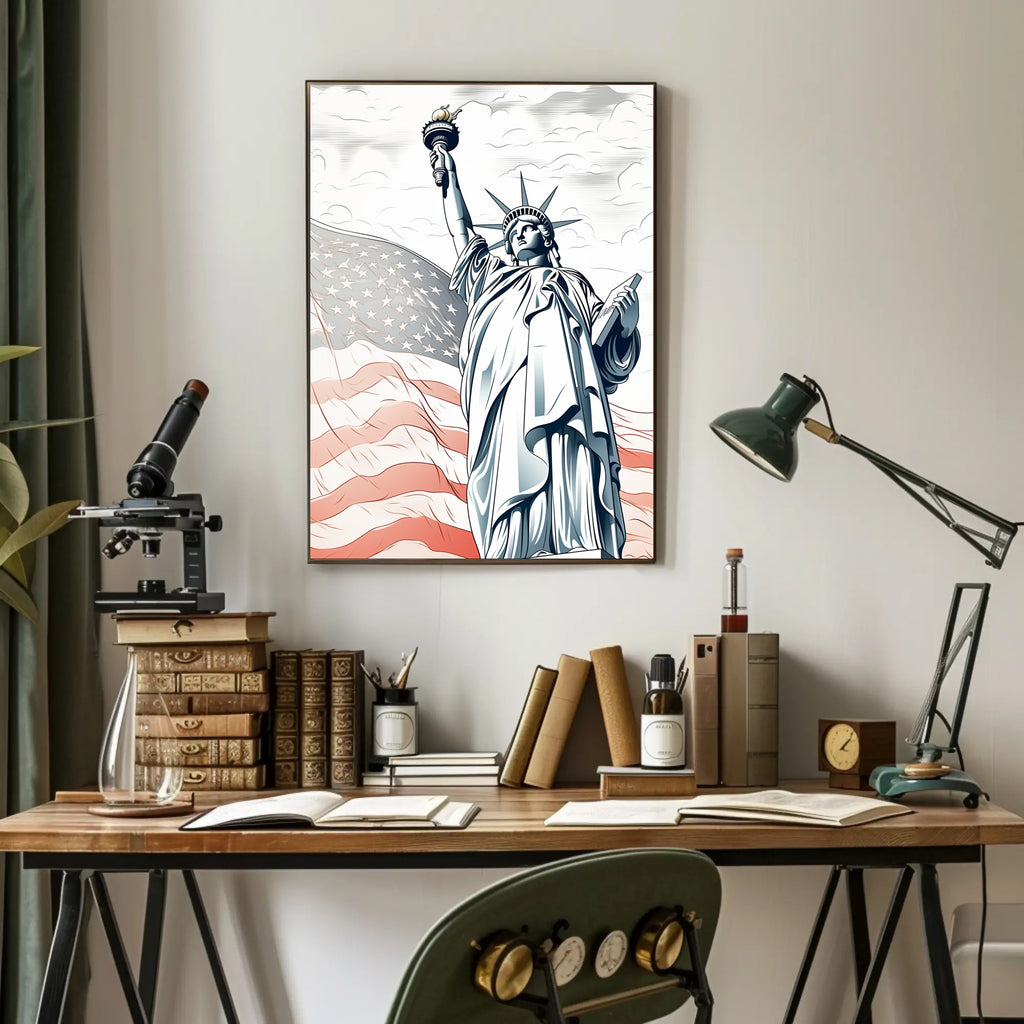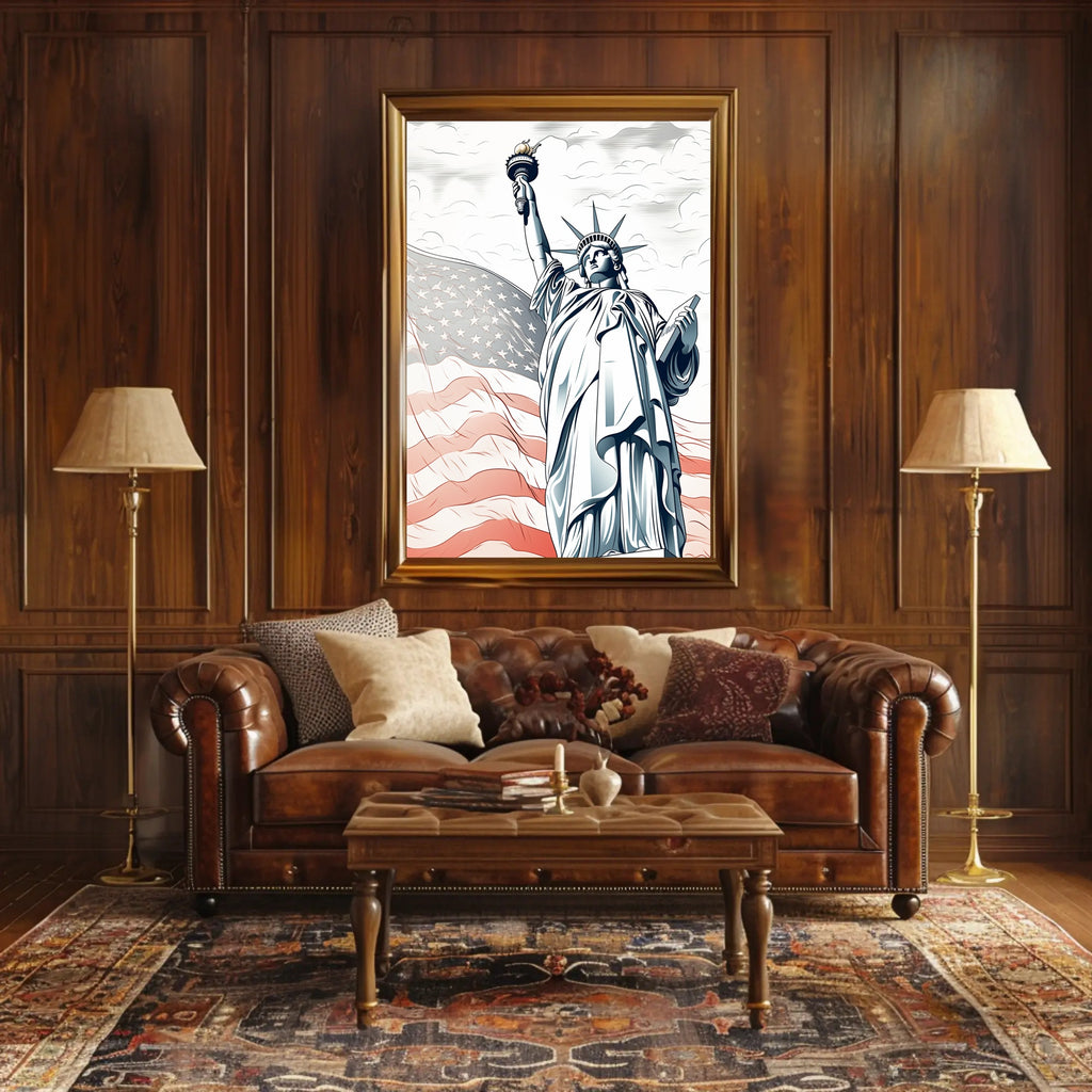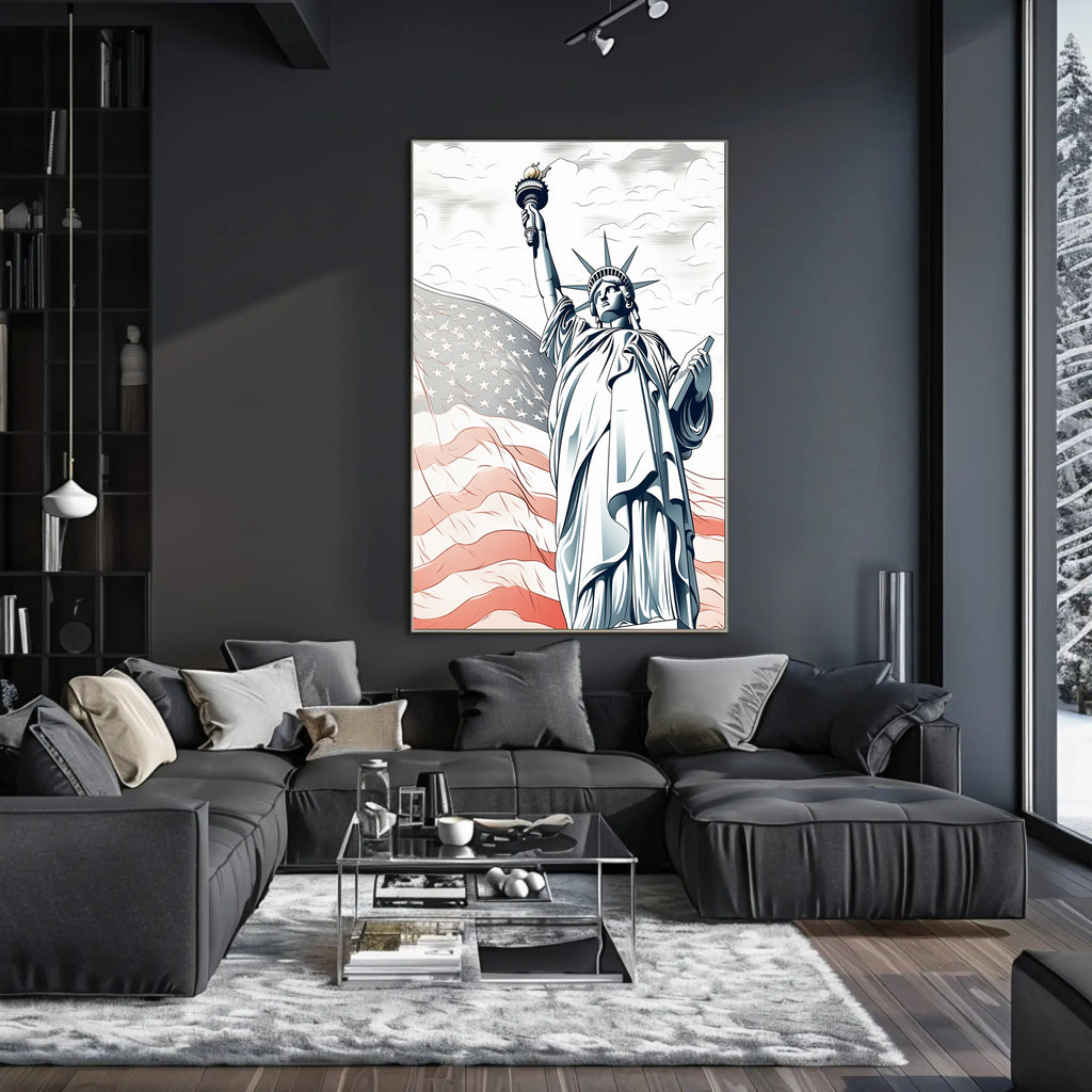 - Iconic imagery: Bold, detailed illustration of the Statue of Liberty with flowing flag backdrop for an instantly recognizable statement piece.