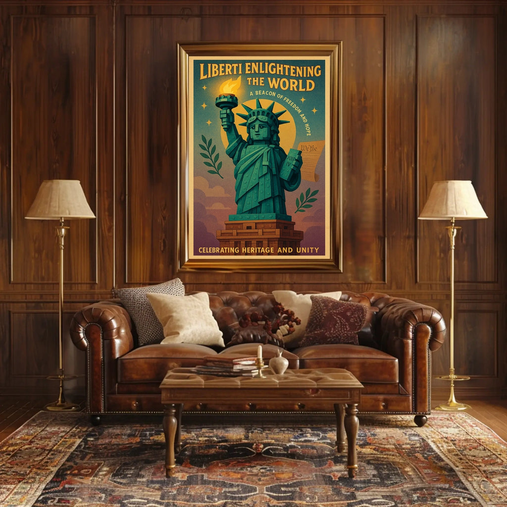 Experience the majesty of the Statue of Liberty like never before with this striking poster that blends modern design and vintage elegance. The artwork reimagines the iconic statue in bold colors and geometric shapes, conveying freedom, enlightenment, and timeless cultural heritage for any space.