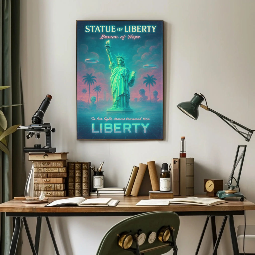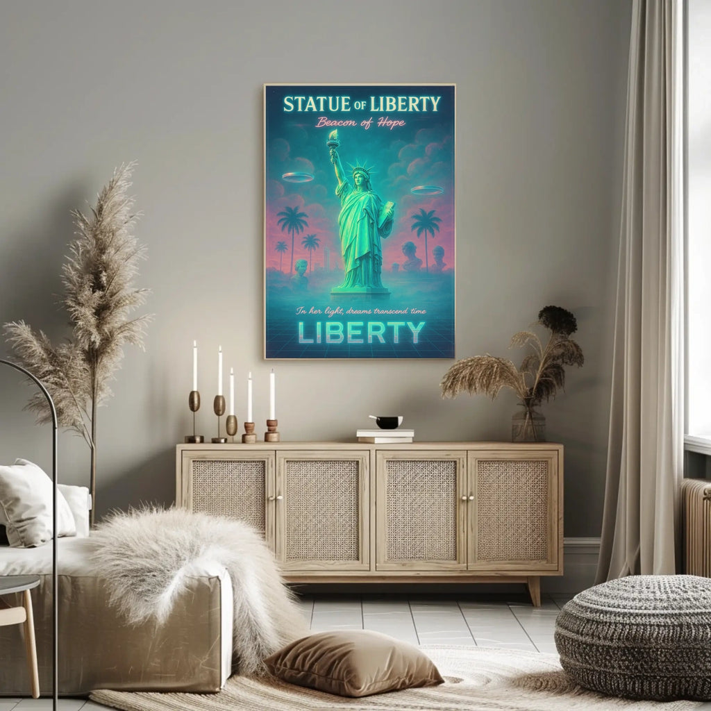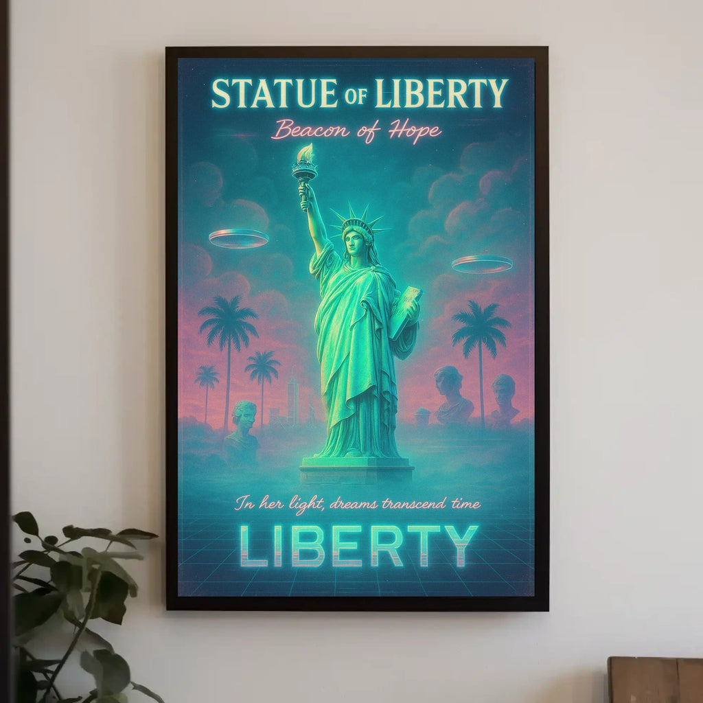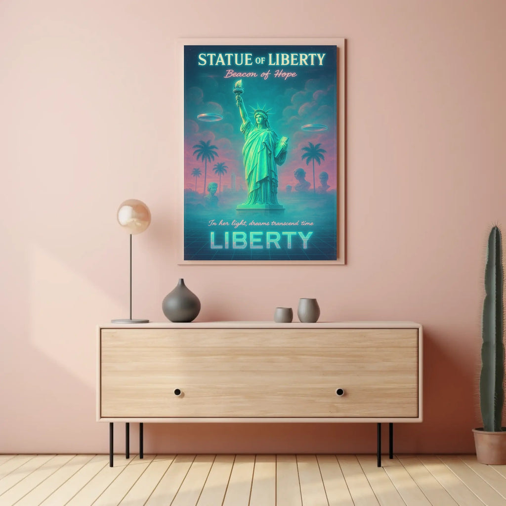 Immerse your space in a bold fusion of iconic symbolism and surreal futurism with this neon-lit poster. A dreamy Statue of Liberty rises beside palm trees on a grid-like ground, bathed in teal and pink glow. This artwork merges the timeless emblem of hope with retro-futuristic flair for standout wall decor.