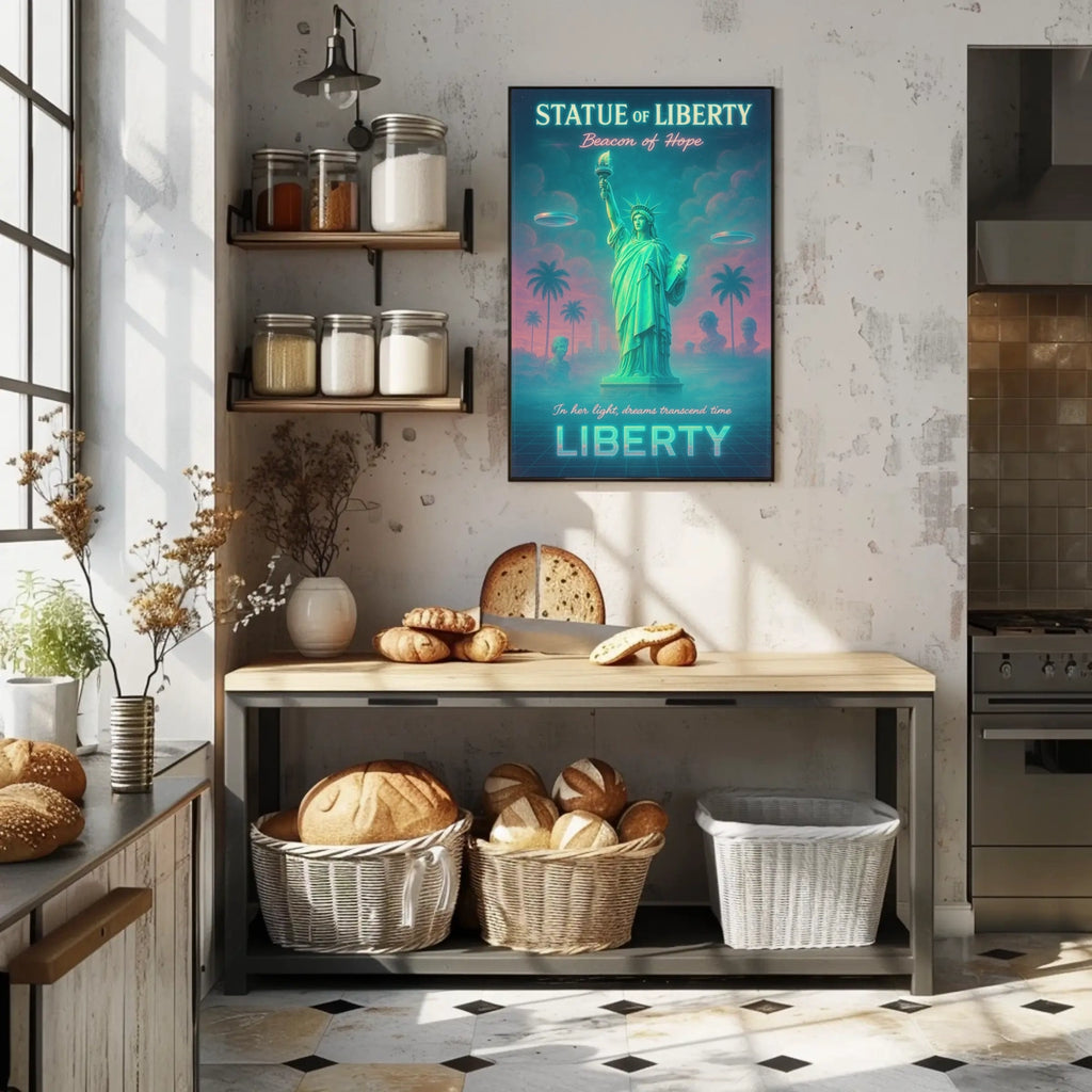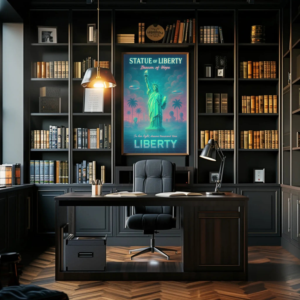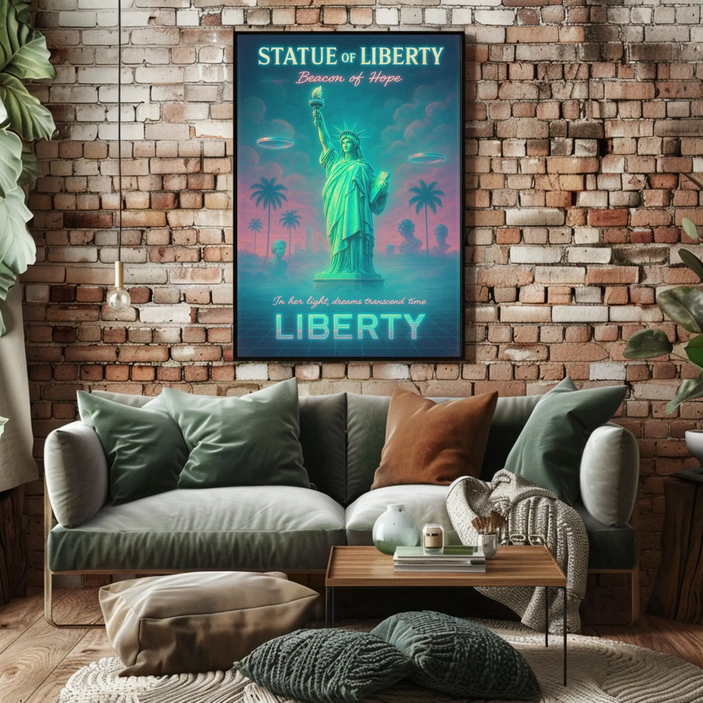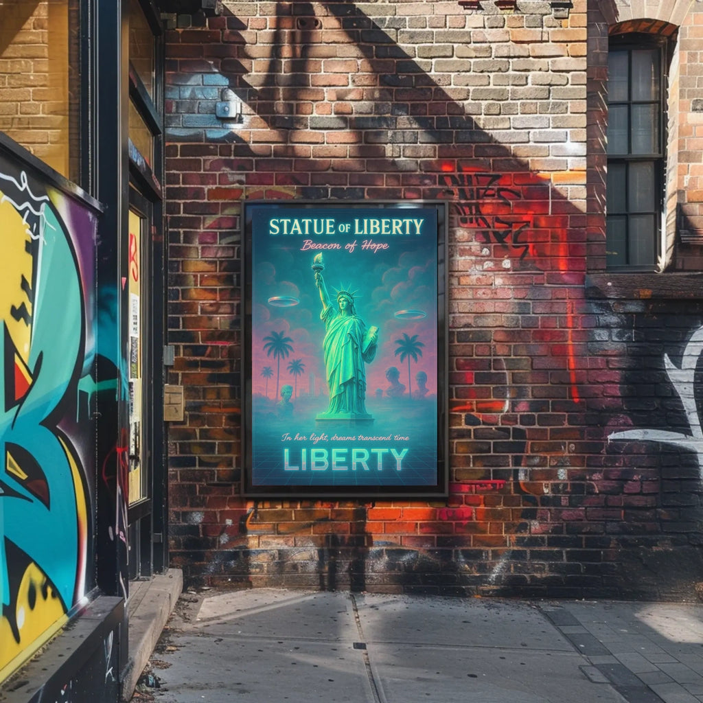 Immerse your space in a bold fusion of iconic symbolism and surreal futurism with this neon-lit poster. A dreamy Statue of Liberty rises beside palm trees on a grid-like ground, bathed in teal and pink glow. This artwork merges the timeless emblem of hope with retro-futuristic flair for standout wall decor.