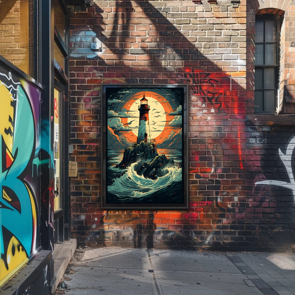 Printed with archival inks to preserve the illustration's rich teal, orange, and cream palette, this poster is part of PosterGoat’s Art & Aesthetic collection and fits perfectly in the Posters category of Home & Garden > Decor > Artwork. Whether you’re curating a gallery wall or adding a single dramatic piece, this lighthouse print draws the eye and sparks imagination.
