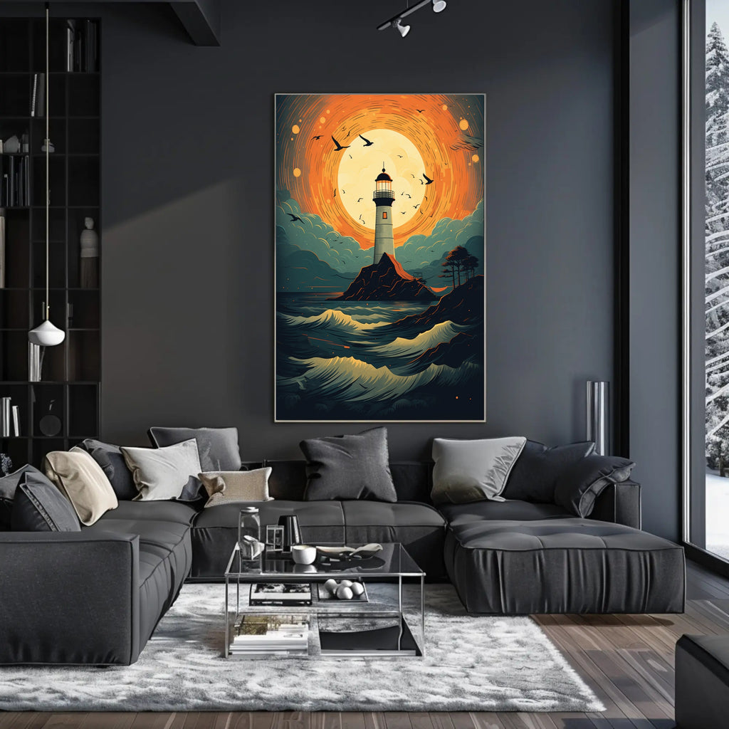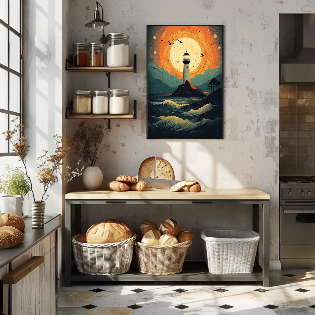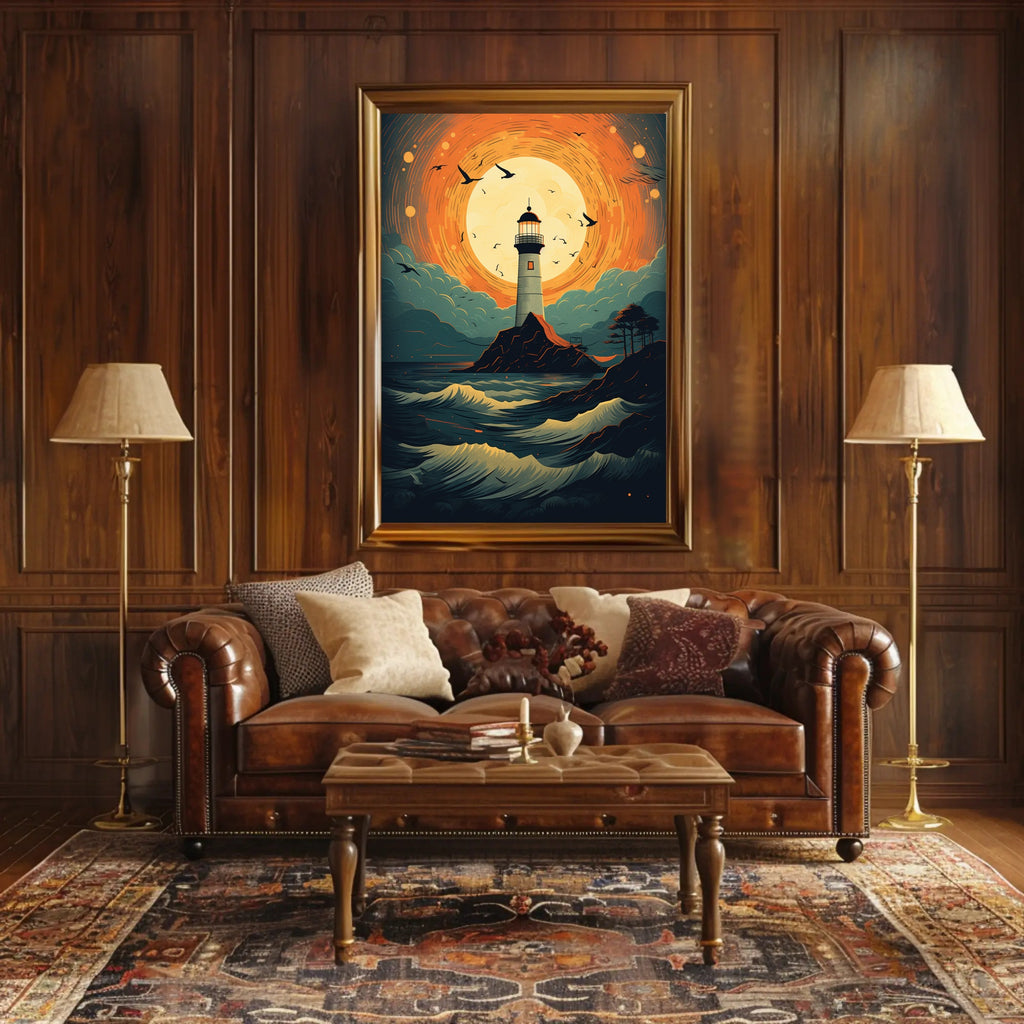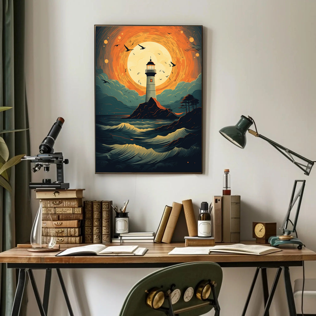 Bring coastal magic into your home with the Lighthouse At Sunset Poster from PosterGoat — a striking pop-art inspired print that pairs bold color with cinematic composition. A towering lighthouse stands sentinel on a rugged isle beneath a blazing, circular sunset; swirling orange skies, teal clouds, and dynamic, cresting waves create movement that draws the eye and sparks conversation.