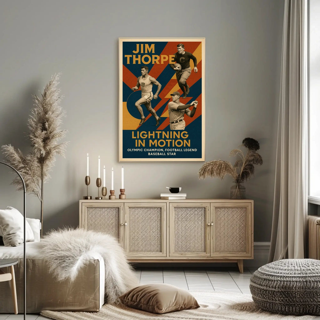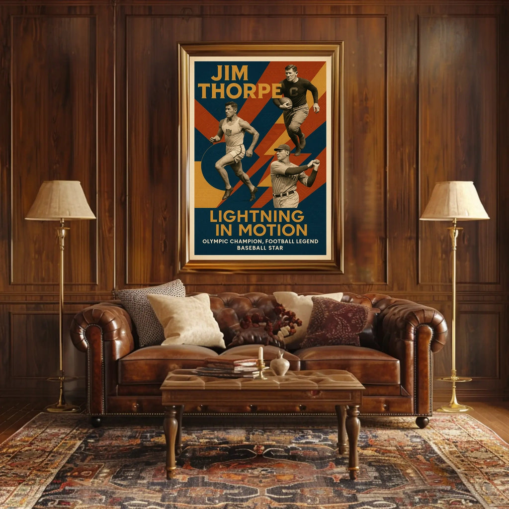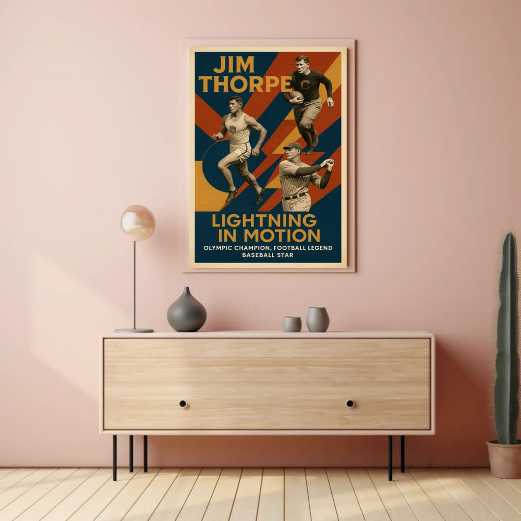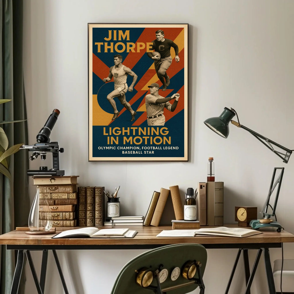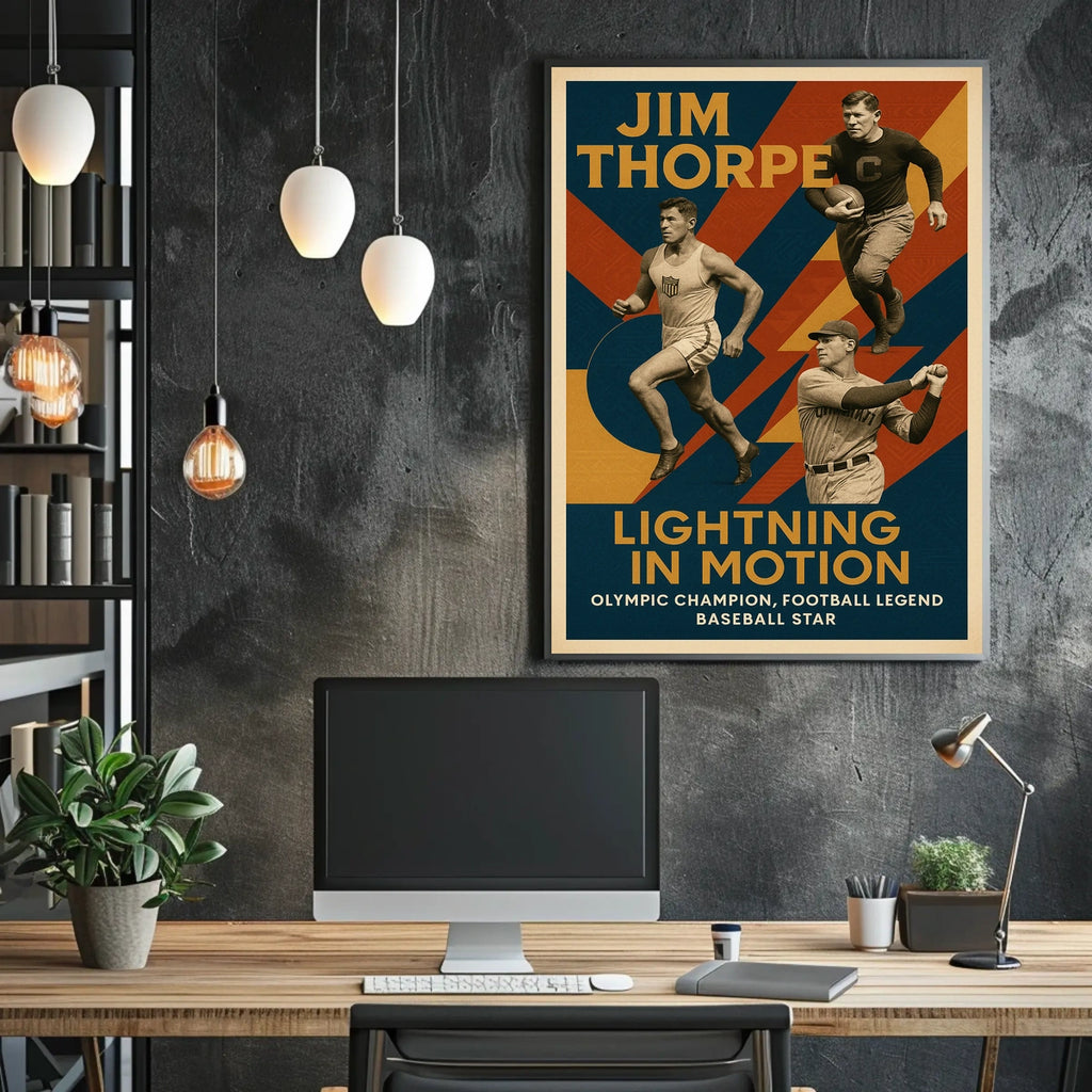 Celebrate the energy and brilliance of a legendary sports icon with the Lightning in Motion Jim Thorpe Poster. This striking artwork captures Thorpe's Olympic triumphs, gridiron grit, and baseball flair, making it a bold centerpiece for any fan's wall.