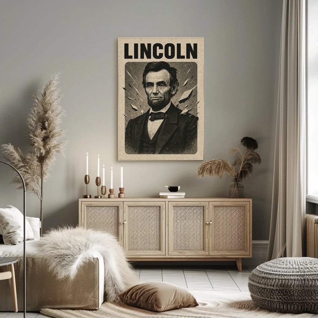 This striking poster captures the iconic essence of Abraham Lincoln, a timeless symbol of leadership and resilience from the 19th century. The portrait showcases an individual in authentic period attire, set against a vintage, textured background that simulates aged paper. The dynamic angular shapes radiating from the figure inject a sense of motion and vitality, while the monochromatic palette emphasizes the illustration's historic charm. With bold typography announcing "LINCOLN," this piece offers a reverent homage to a pivotal figure in American history, making it a powerful addition to any collection of historical memorabilia.