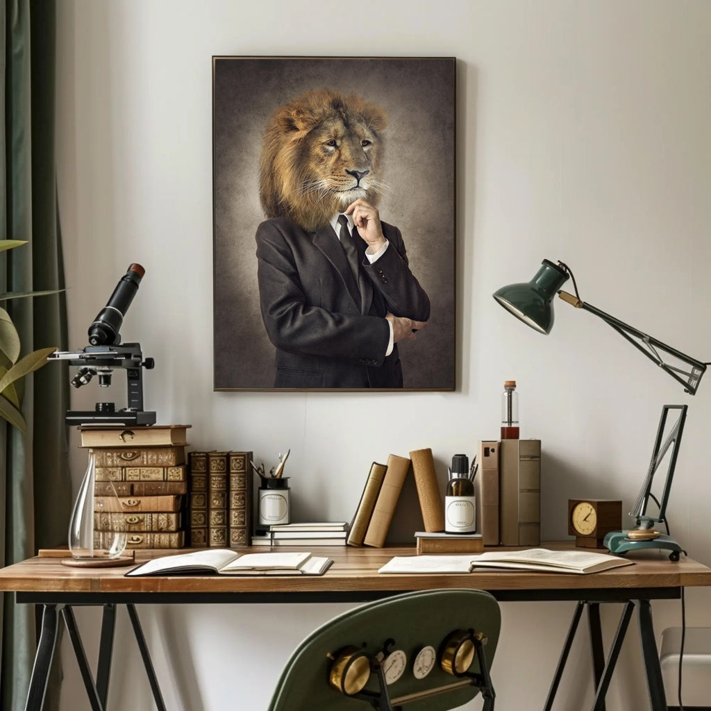 - Distinctive focal point: Photorealistic lion portrait merged with a classic business suit creates an unforgettable centerpiece for any room.