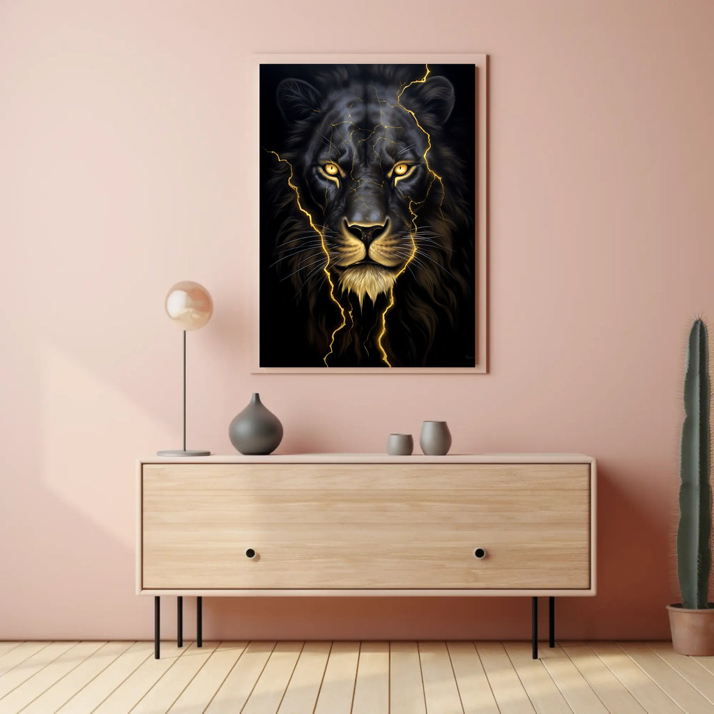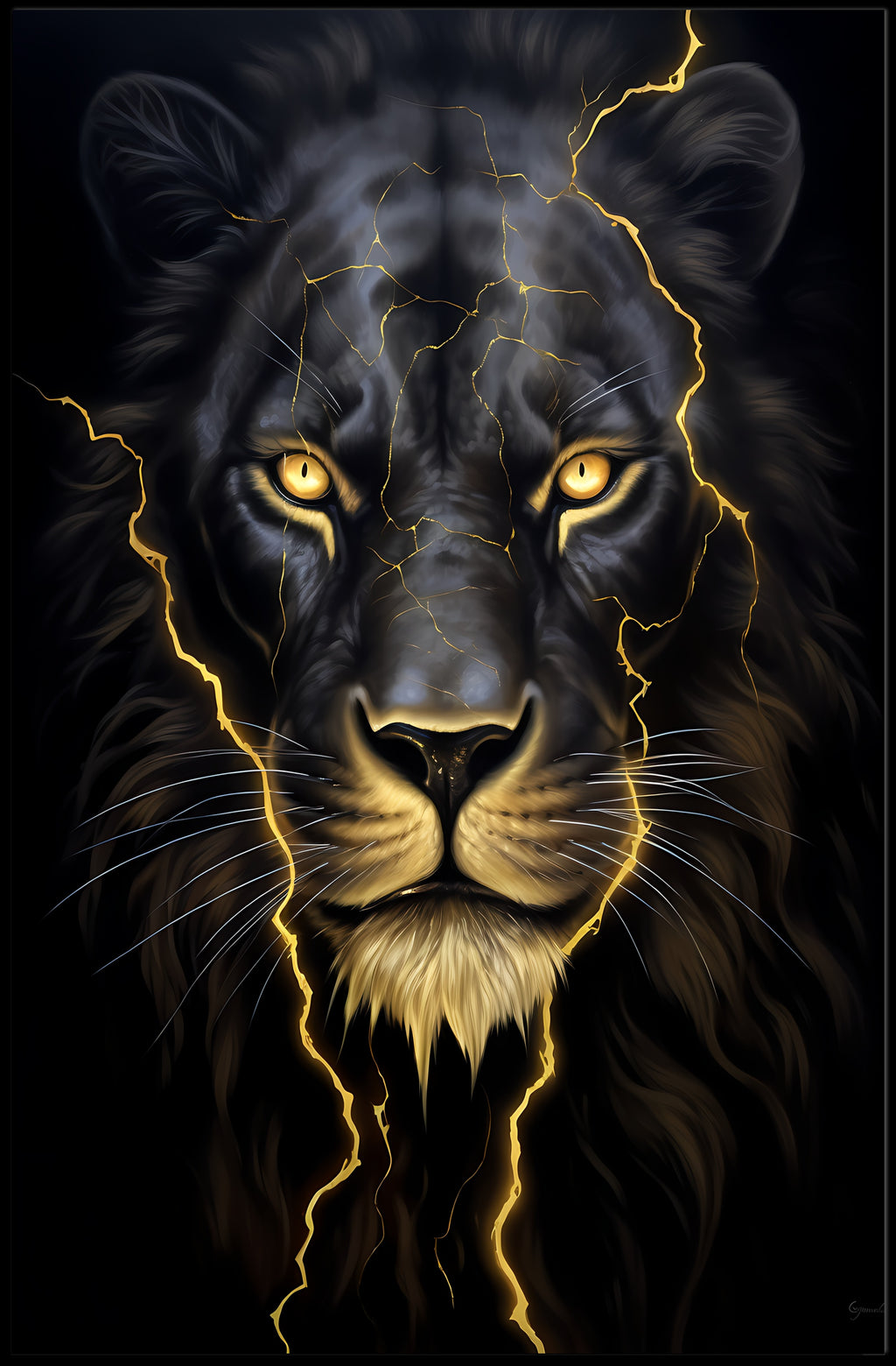 Bold visual motif: Electric gold fissures trace the lion’s face, giving a dramatic, almost mythic energy that transforms any room into a statement space.